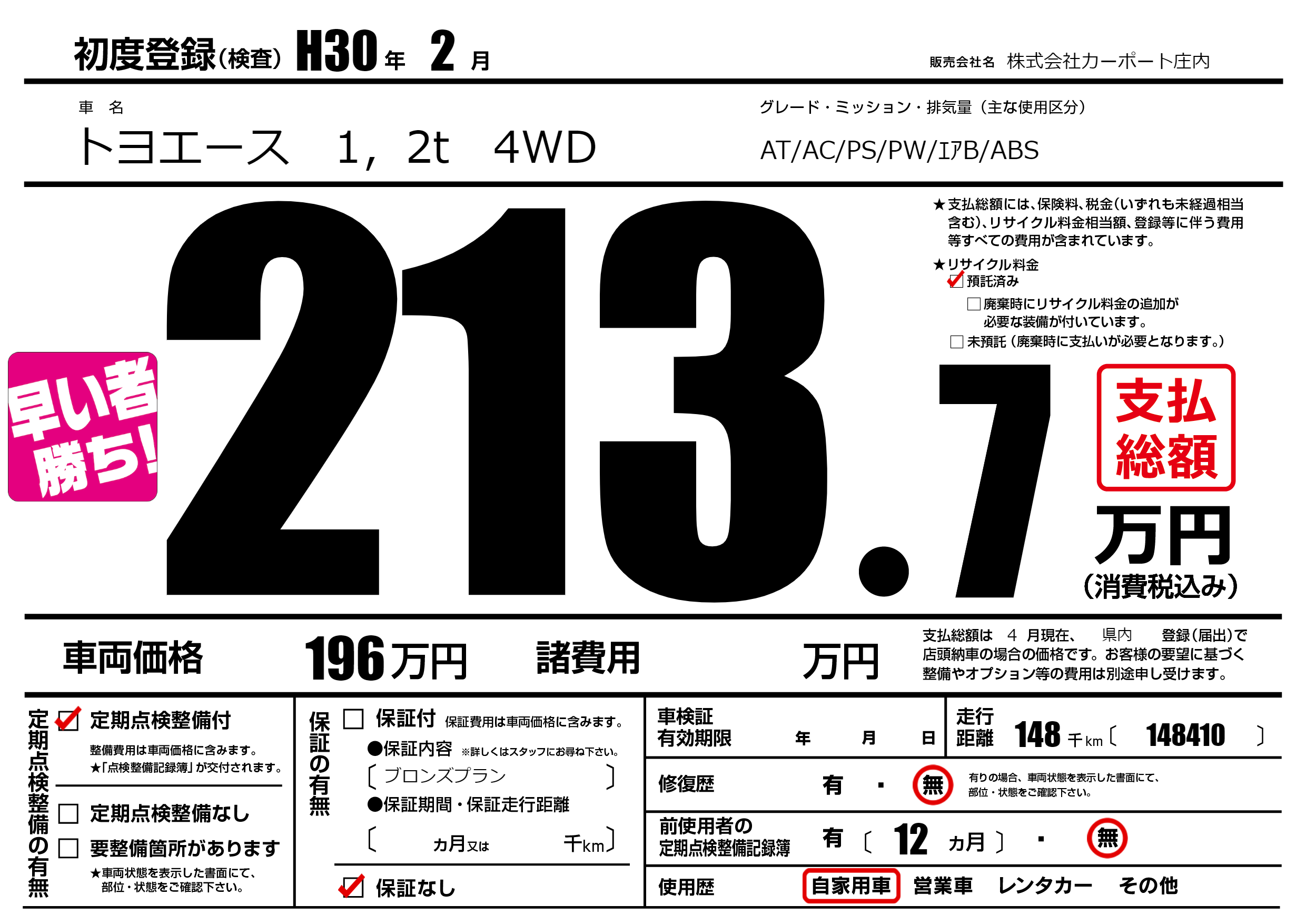 | 走行キロ | 14.8万km | 初年度登録 | H30年2月 |