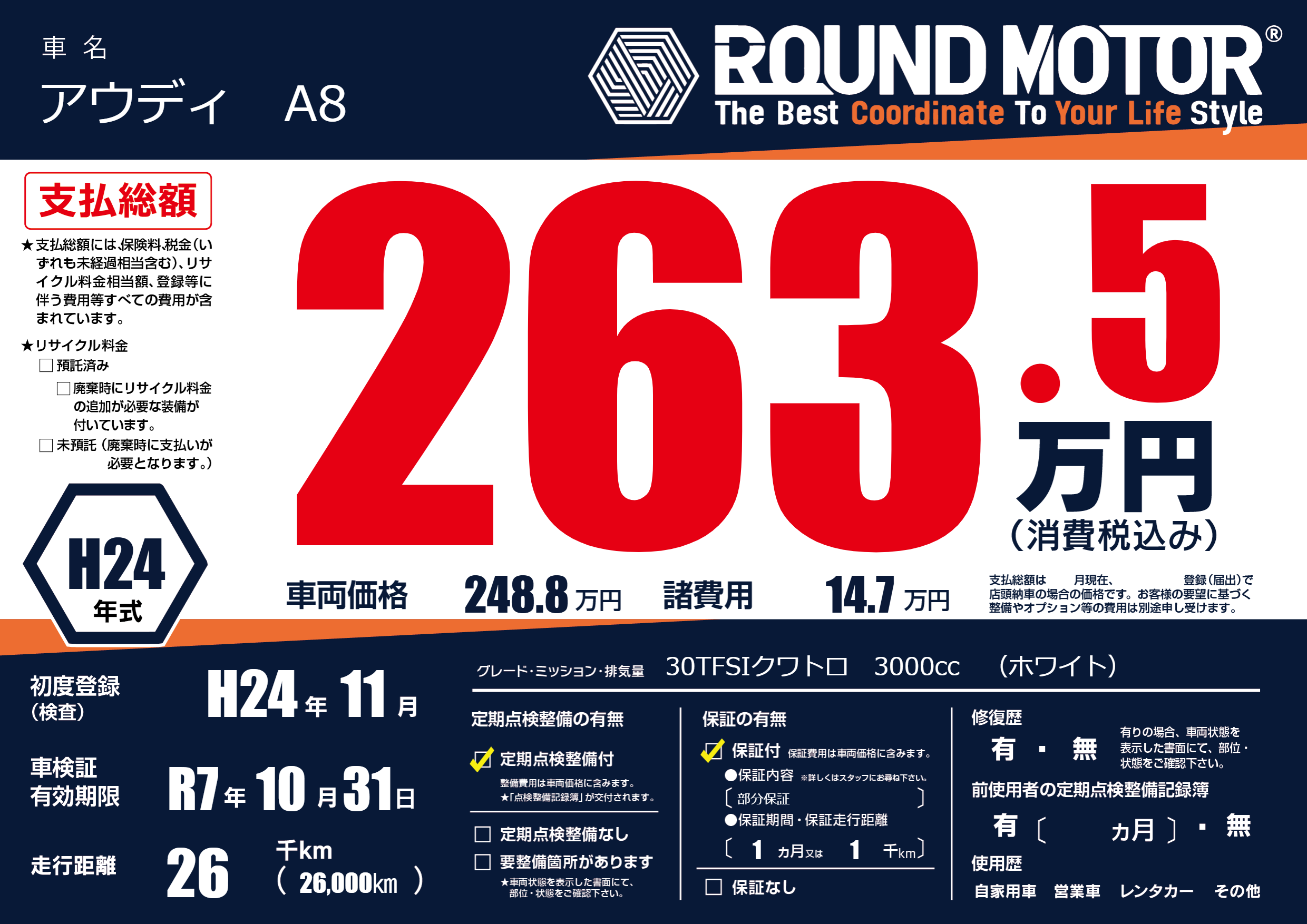 | 車名 | アウディ A8 | グレード ミッション 排気量 |