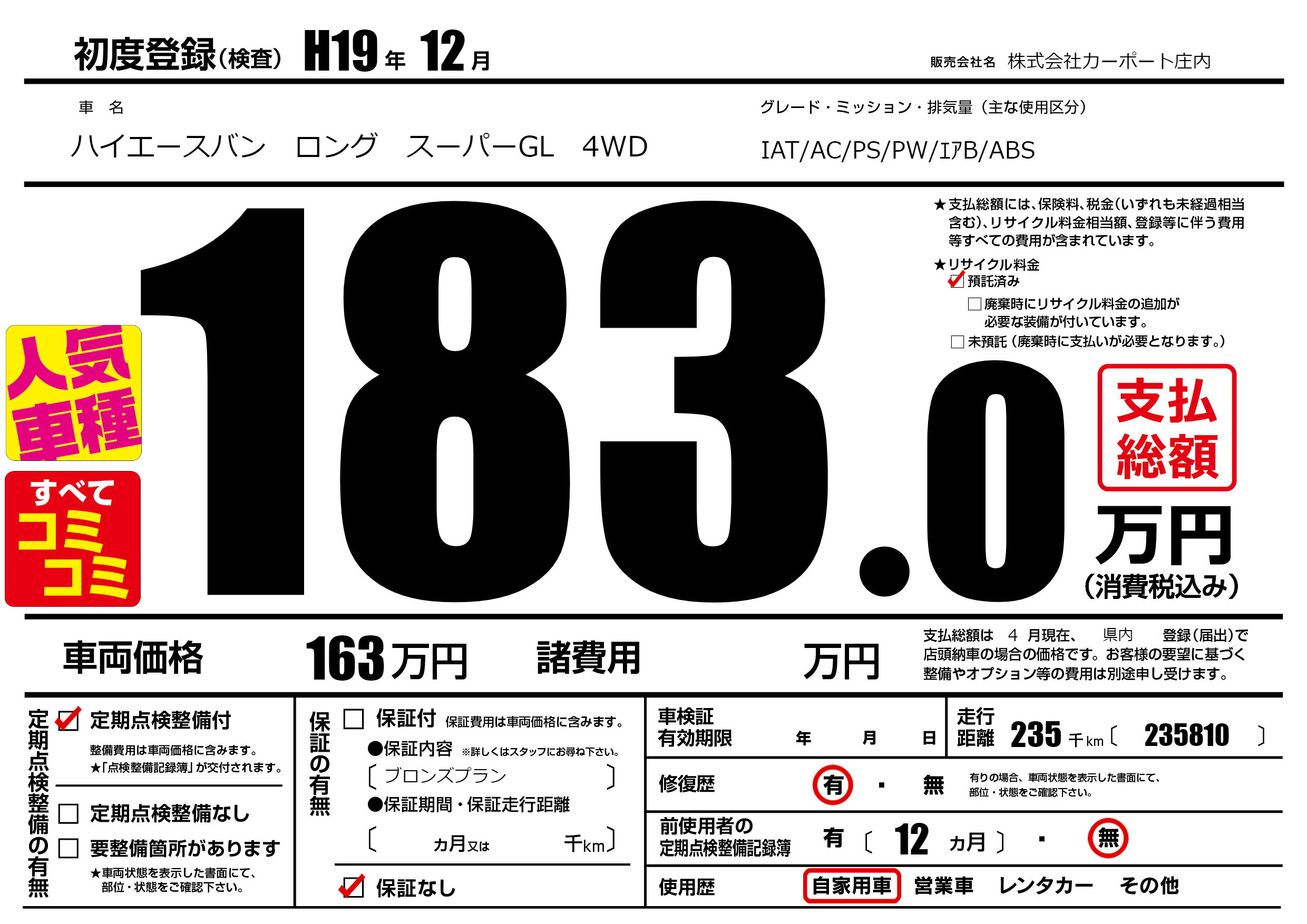 | 走行キロ | 23.5万km | 初年度登録 | H19年12月 |