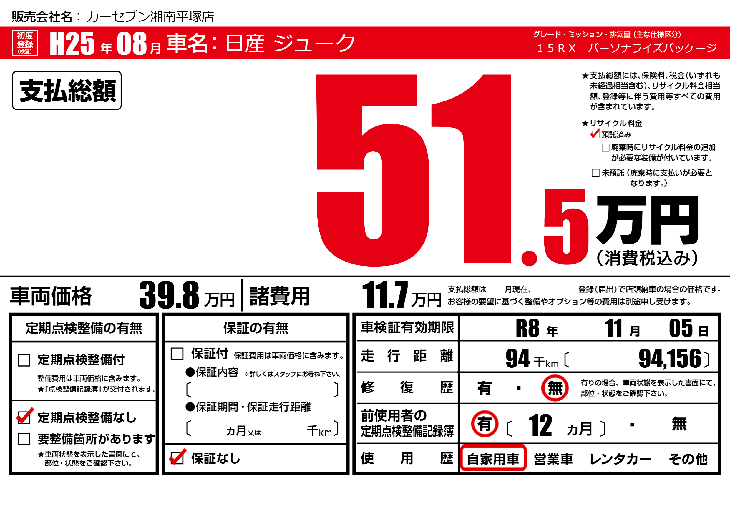 なし | 車検制限 | R8年11月05月 |