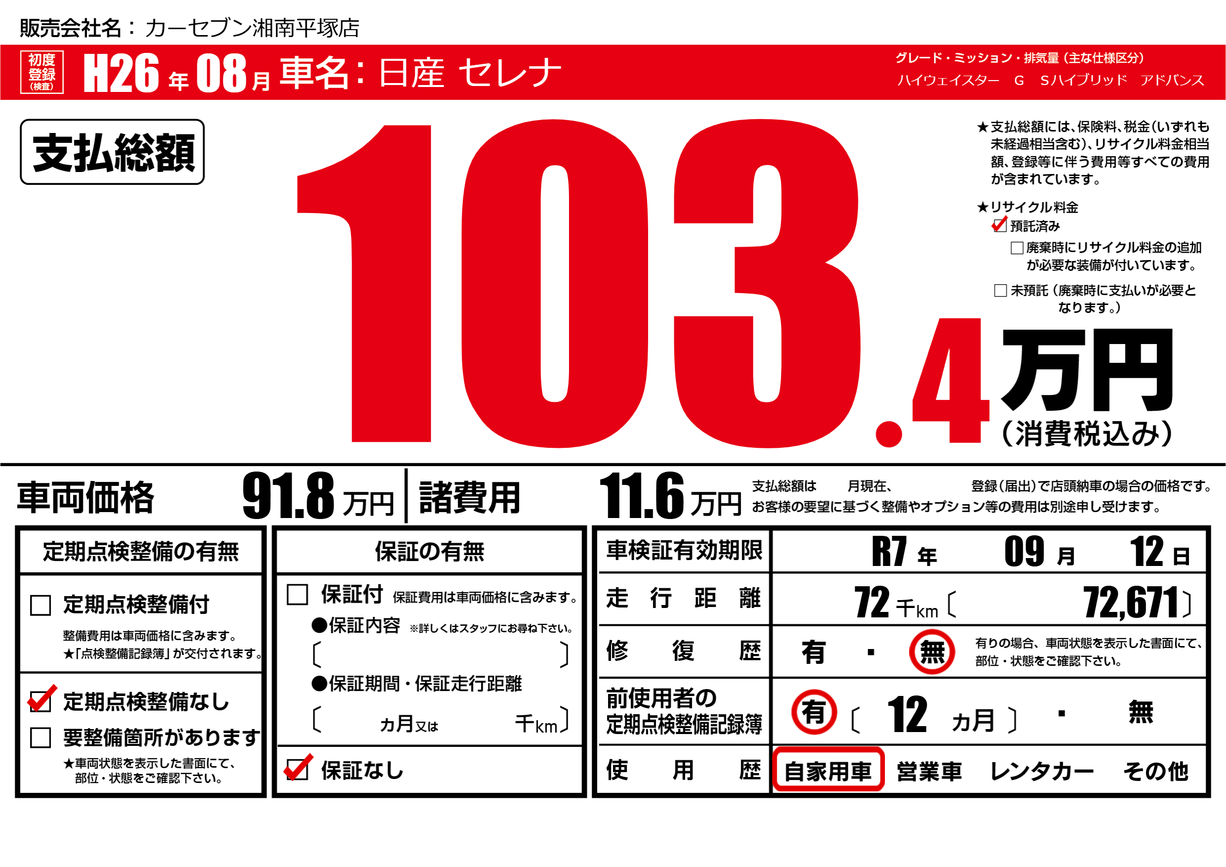 | 車名 | 日産 セレナ | グレード ミッション 排気量 |