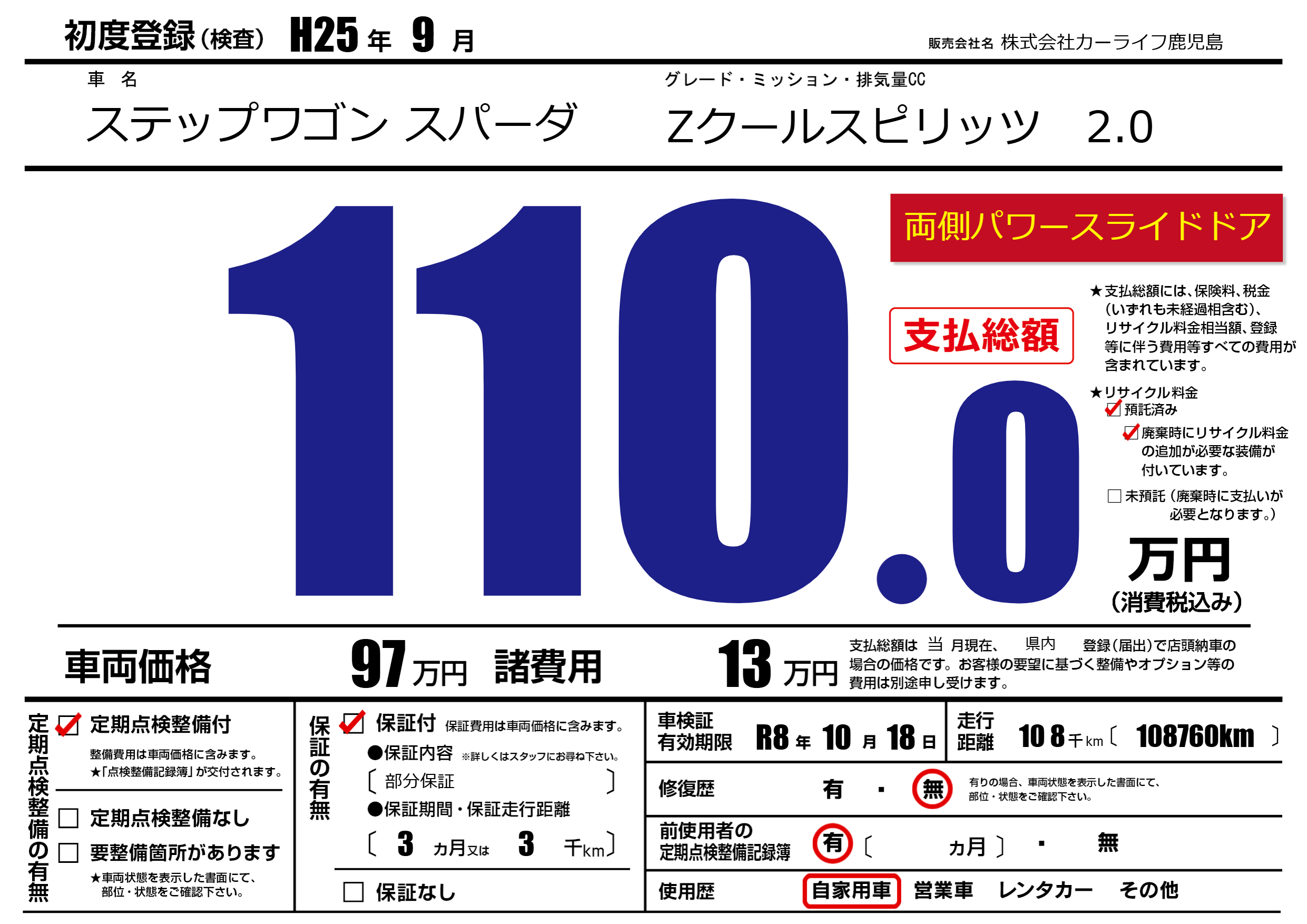 | 車名 | ステップワゴン スパーダ | グレード ミッション 排気量 |