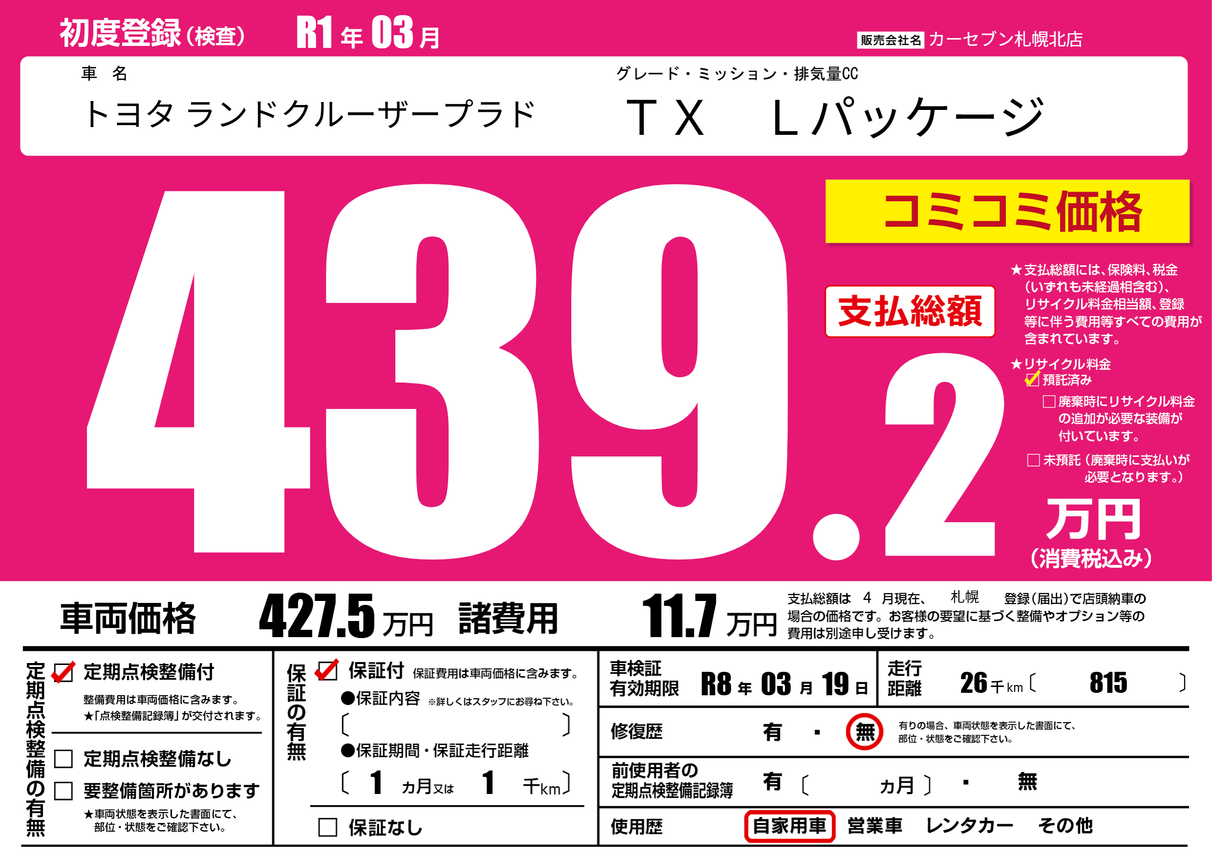 | 車名 | トヨタ ランドクルーザープラド | グレード ミッション 排気量 |