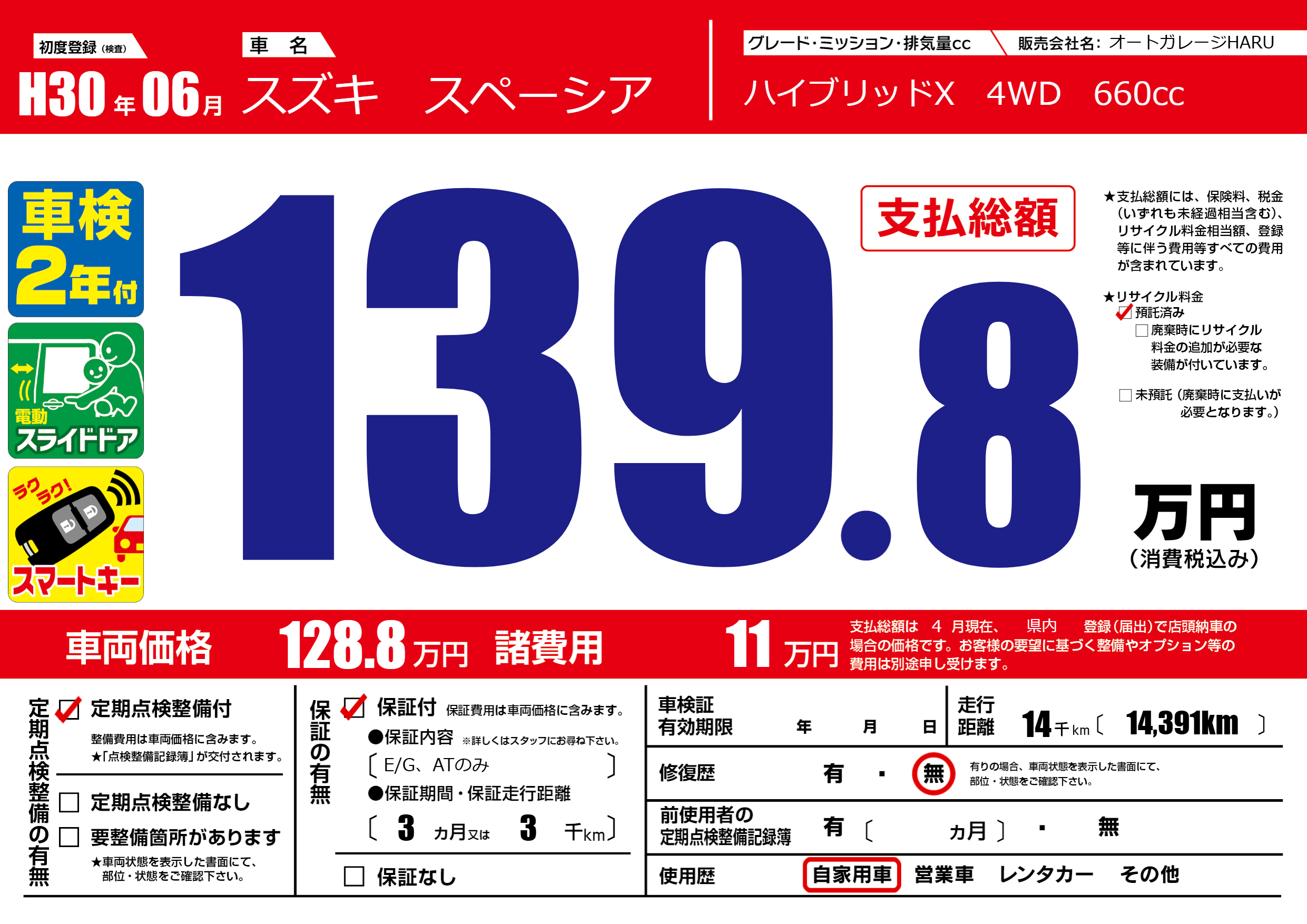 | 走行キロ | 1.4万km | 初年度登録 | H30年06月 |