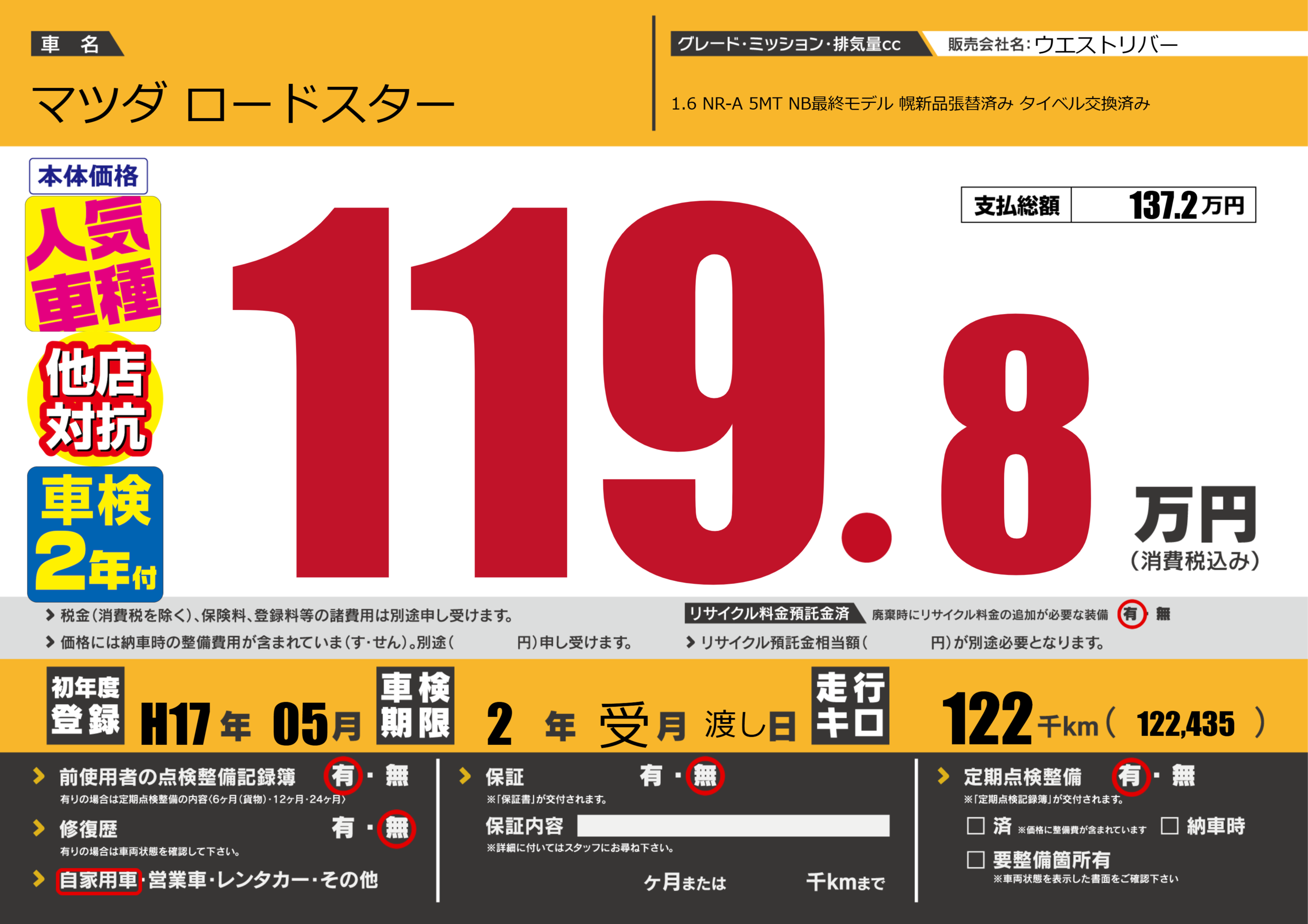 | 走行キロ | 12.2万km | 初年度登録 | H17年05月 |