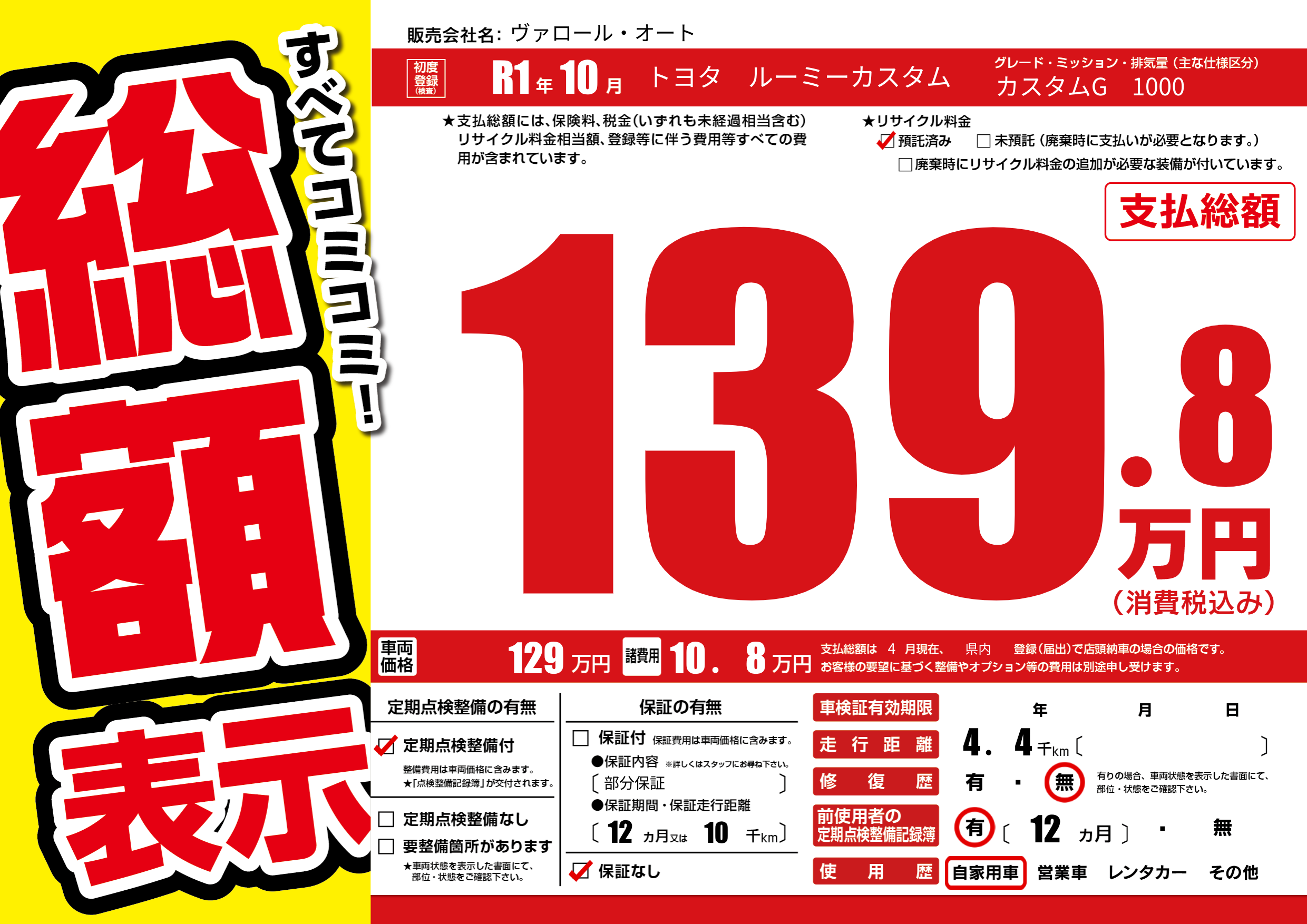 | 走行キロ | 0.4万km | 初年度登録 | R1年10月 |