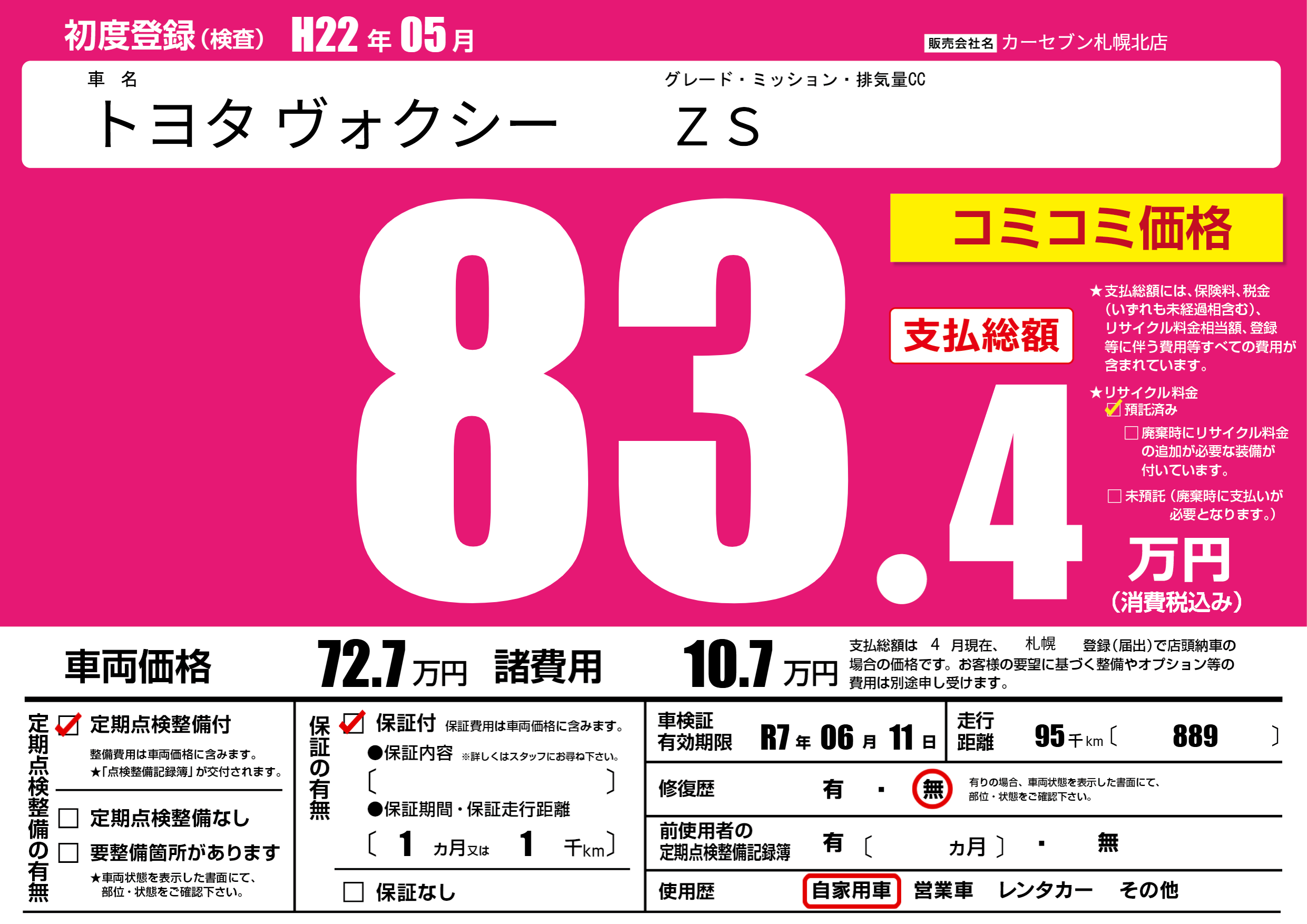 | 走行キロ | 9.5万km | 初年度登録 | H22年05月 |