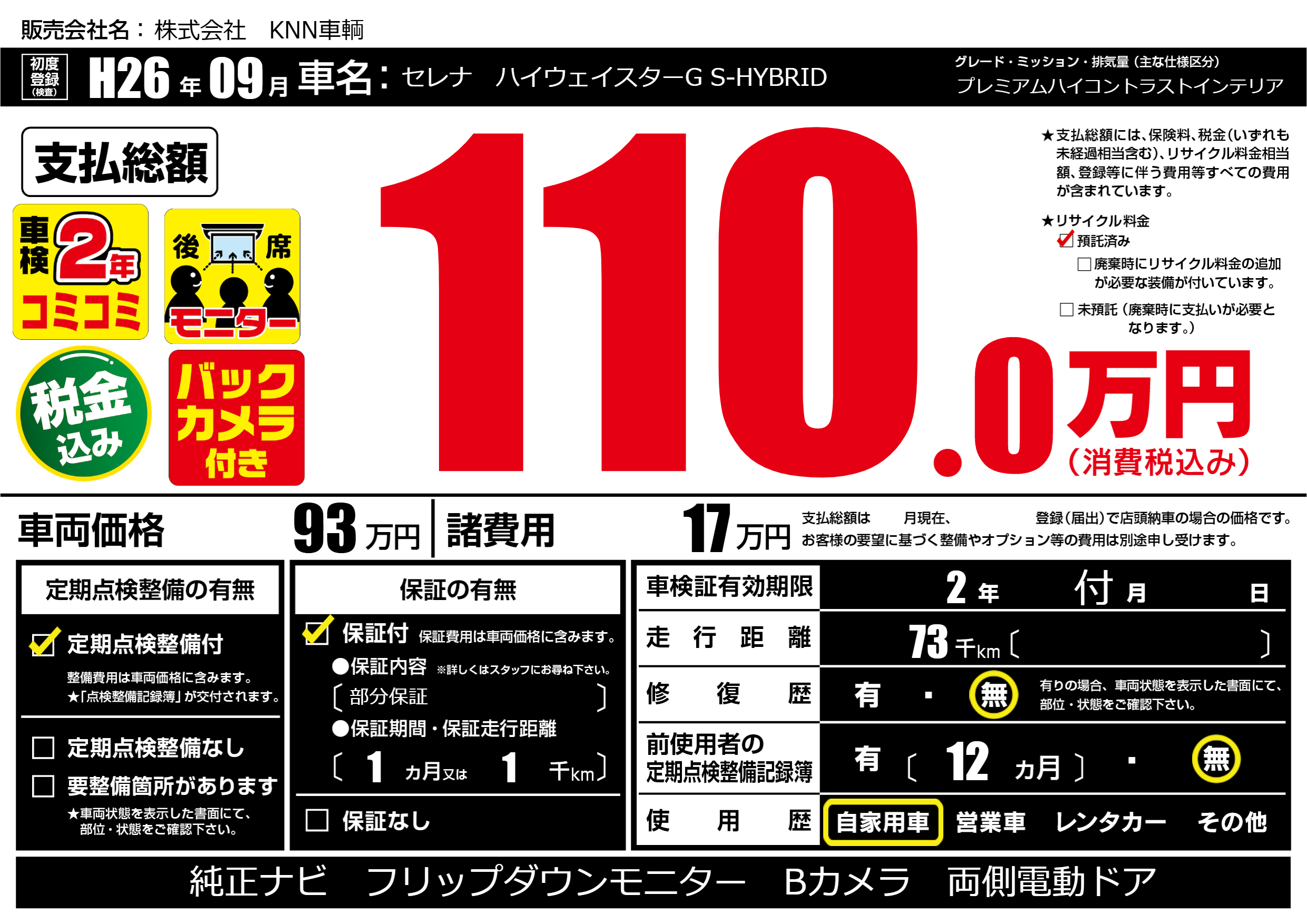 | 車名 | セレナ ハイウェイスターG S-HYBRID | グレード ミッション 排気量 |