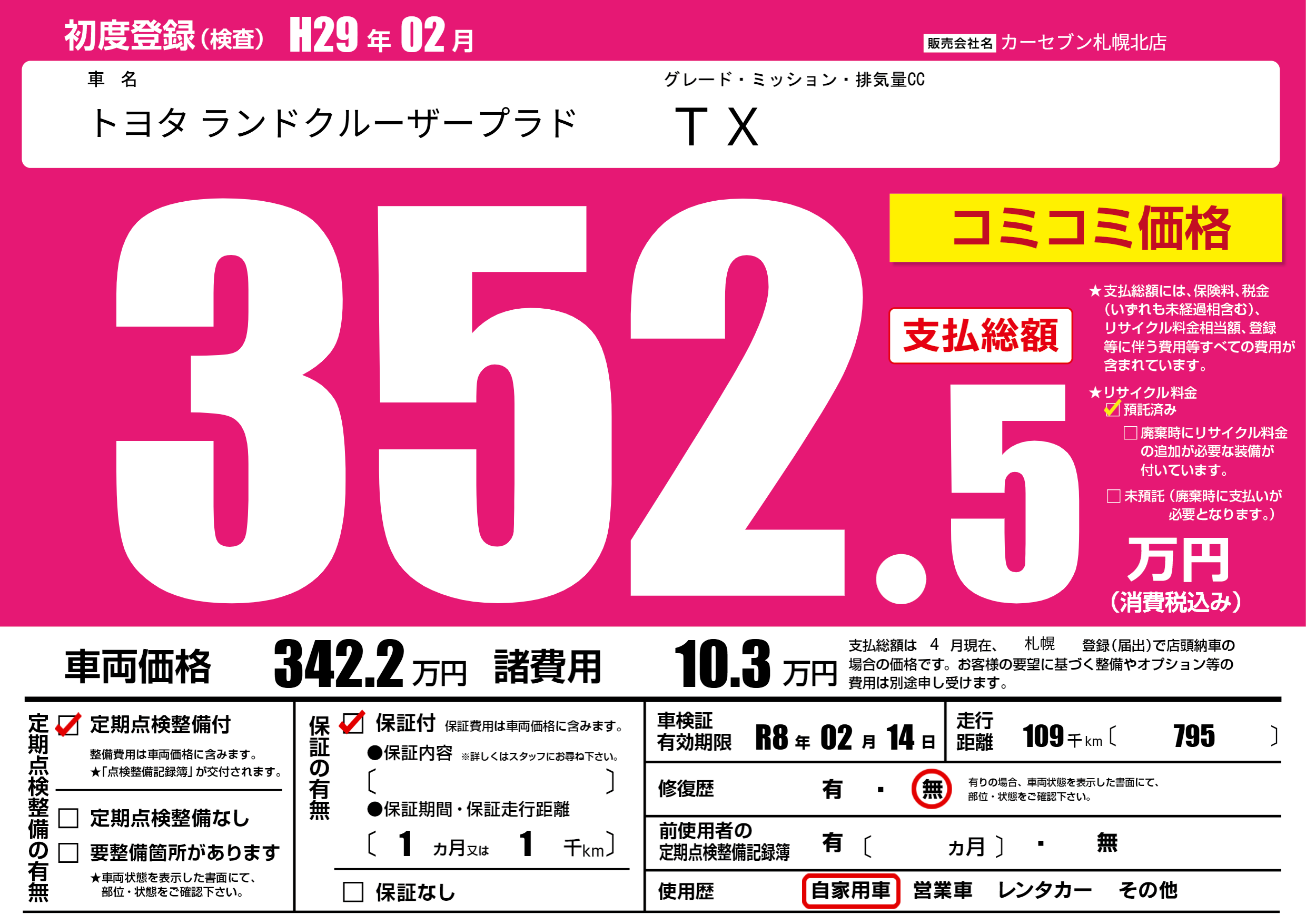 | 車名 | トヨタ ランドクルーザープラド | グレード ミッション 排気量 |