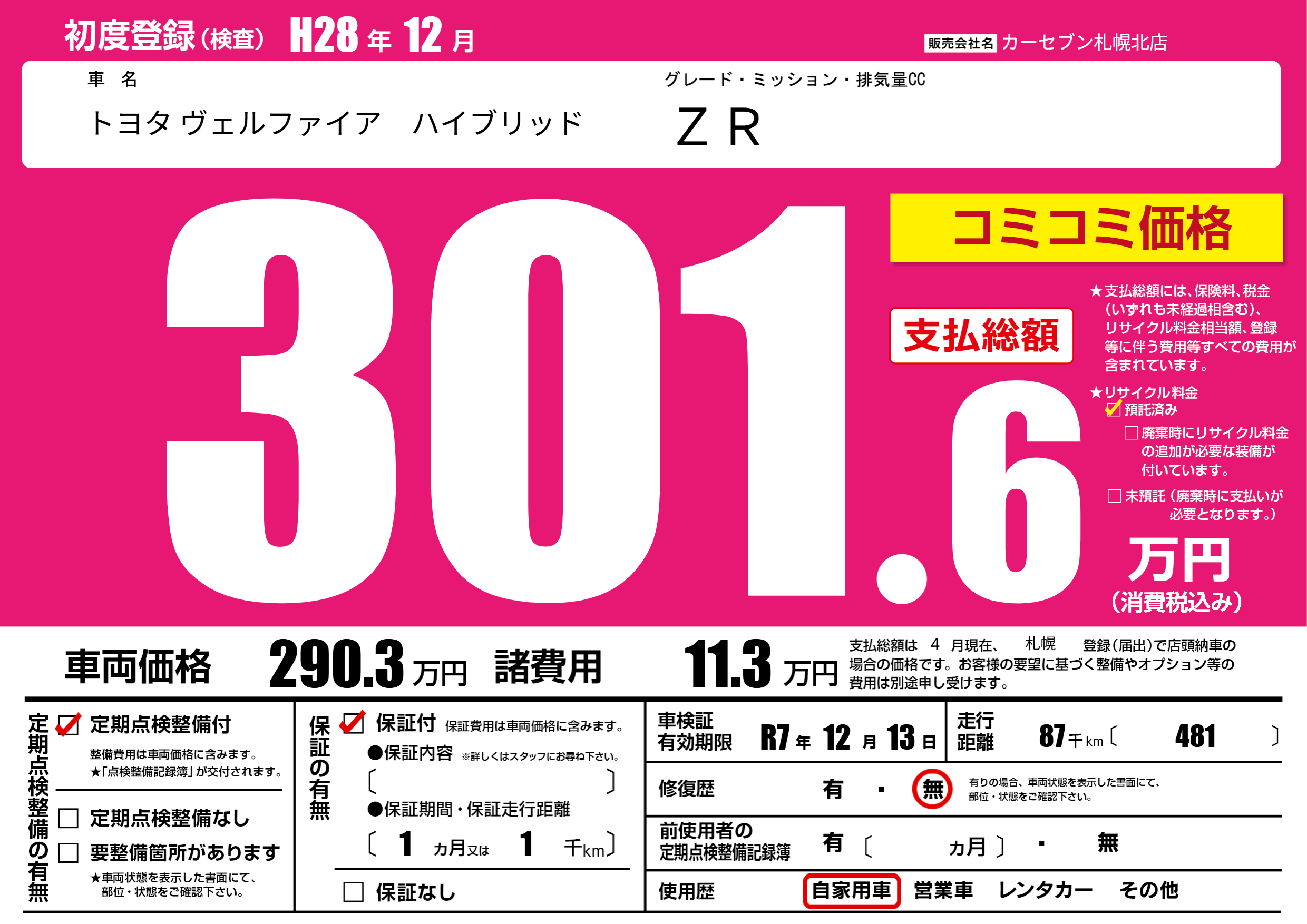 | 走行キロ | 8.7万km | 初年度登録 | H28年12月 |