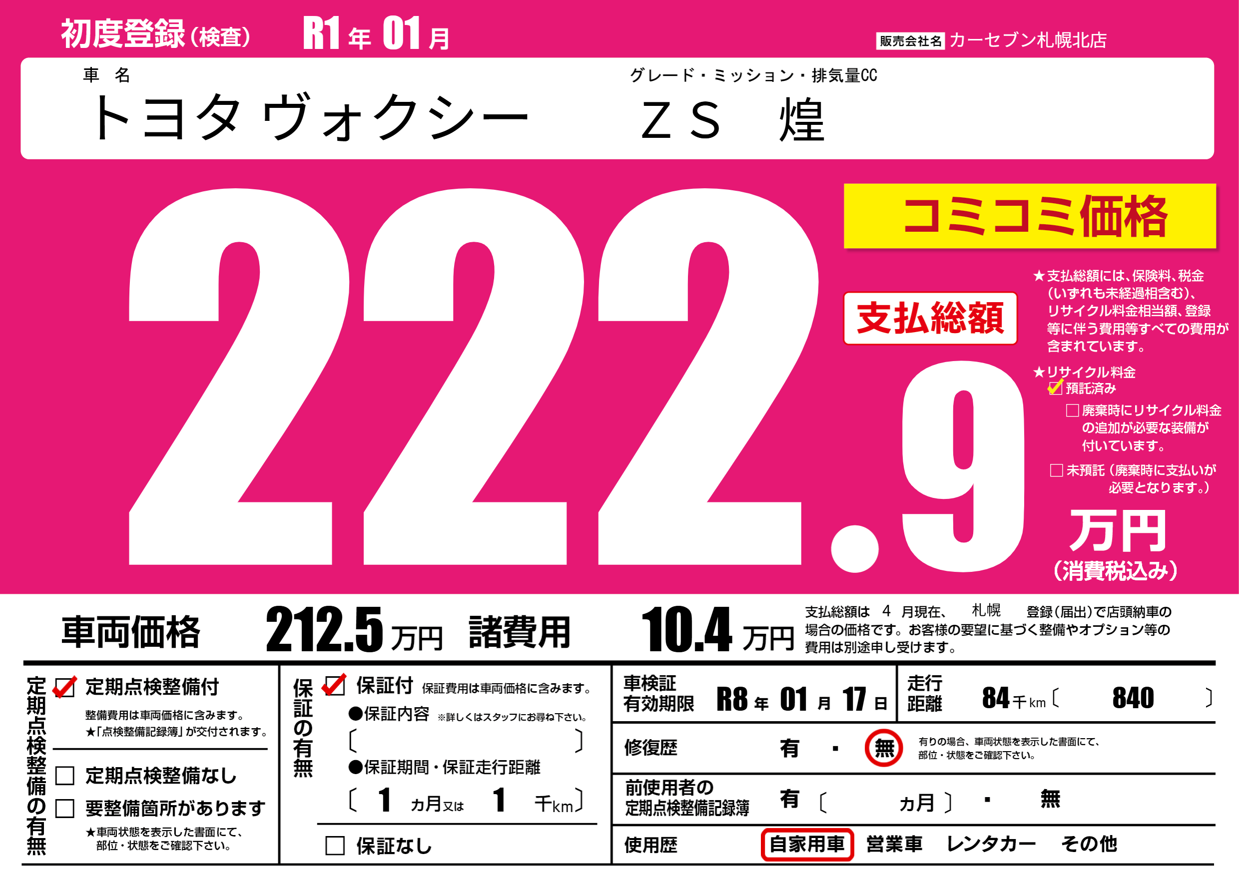| 車名 | トヨタ ヴォクシー | グレード ミッション 排気量 |