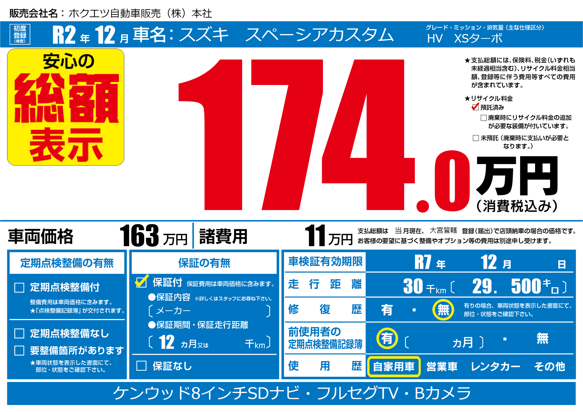 | 走行キロ | 3万km | 初年度登録 | R2年12月 |