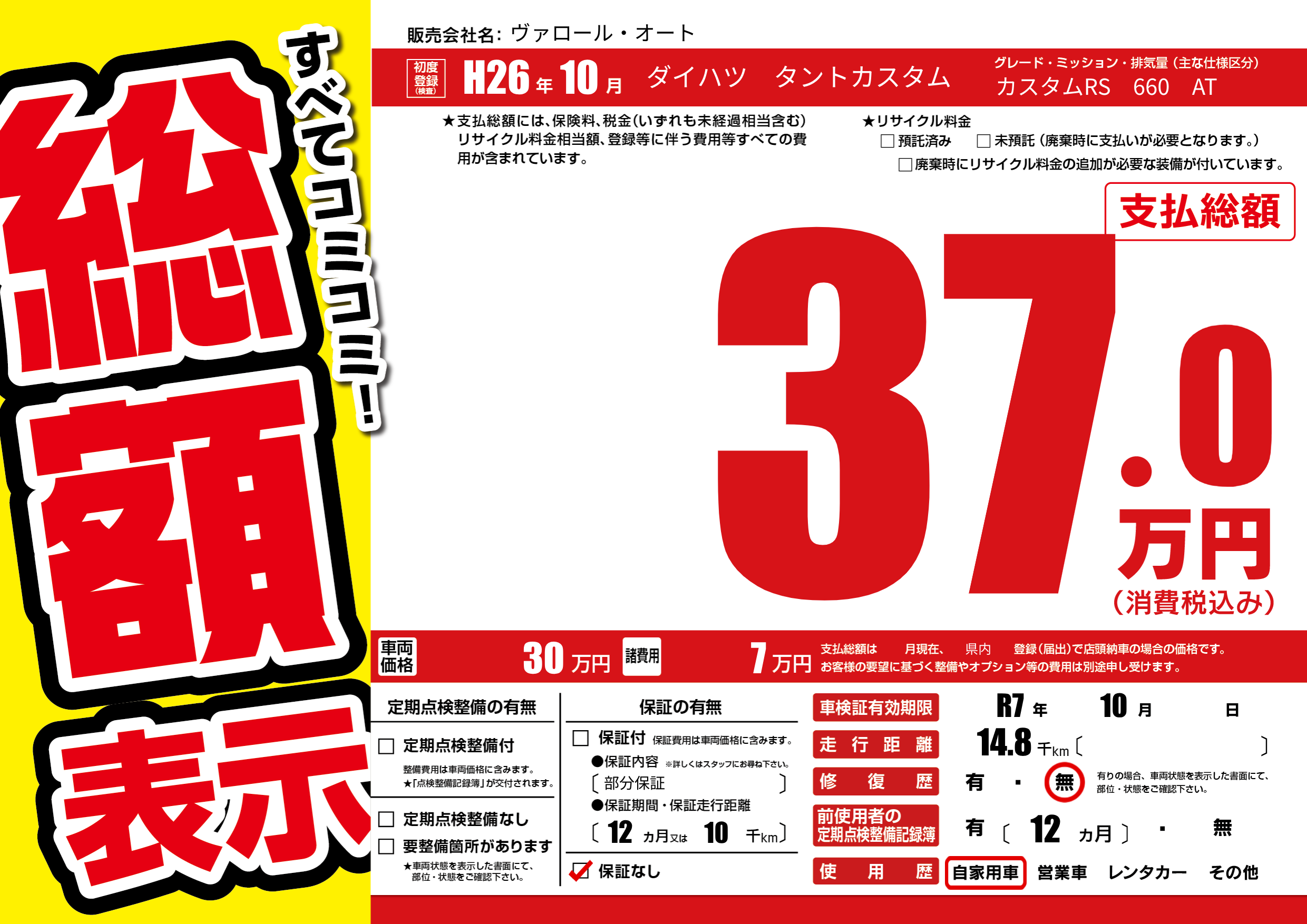 | 車名 | ダイハツ タントカスタム | グレード ミッション 排気量 |