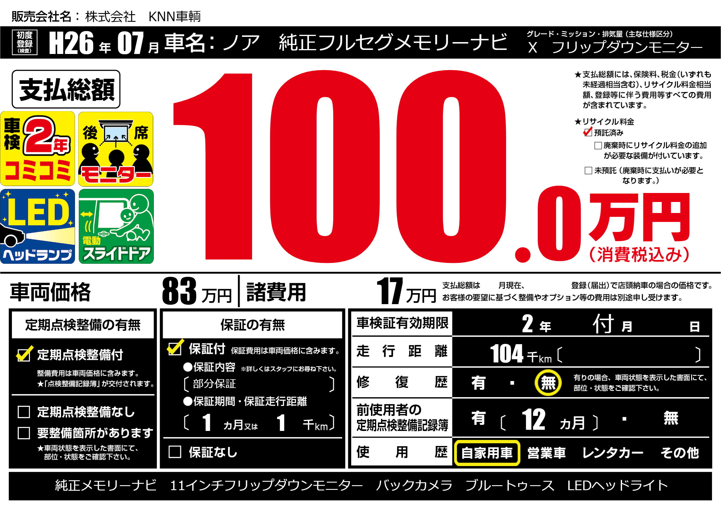 | 走行キロ | 10.4万km | 初年度登録 | H26年07月 |