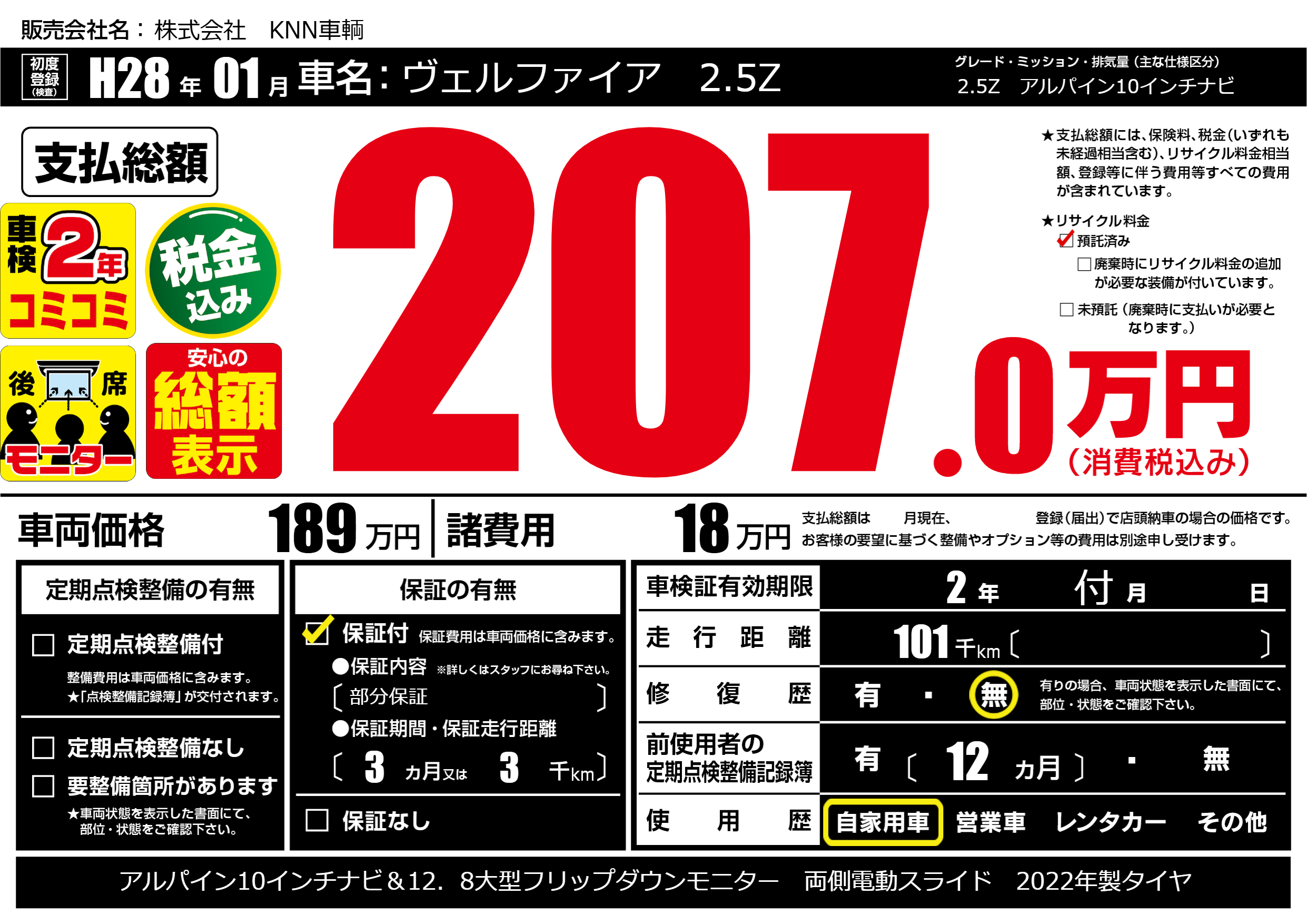 | 車名 | ヴェルファイア 2.5Z | グレード ミッション 排気量 |