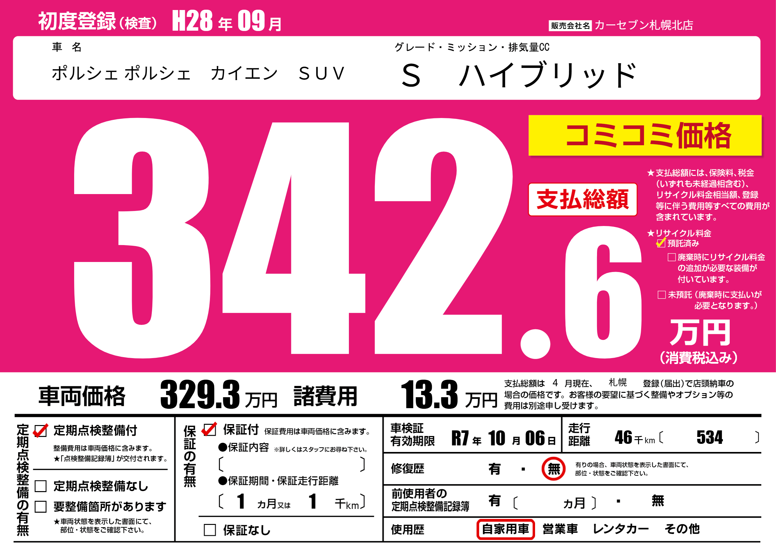 | 車名 | ポルシェ ポルシェ カイエン SUV | グレード ミッション 排気量 |