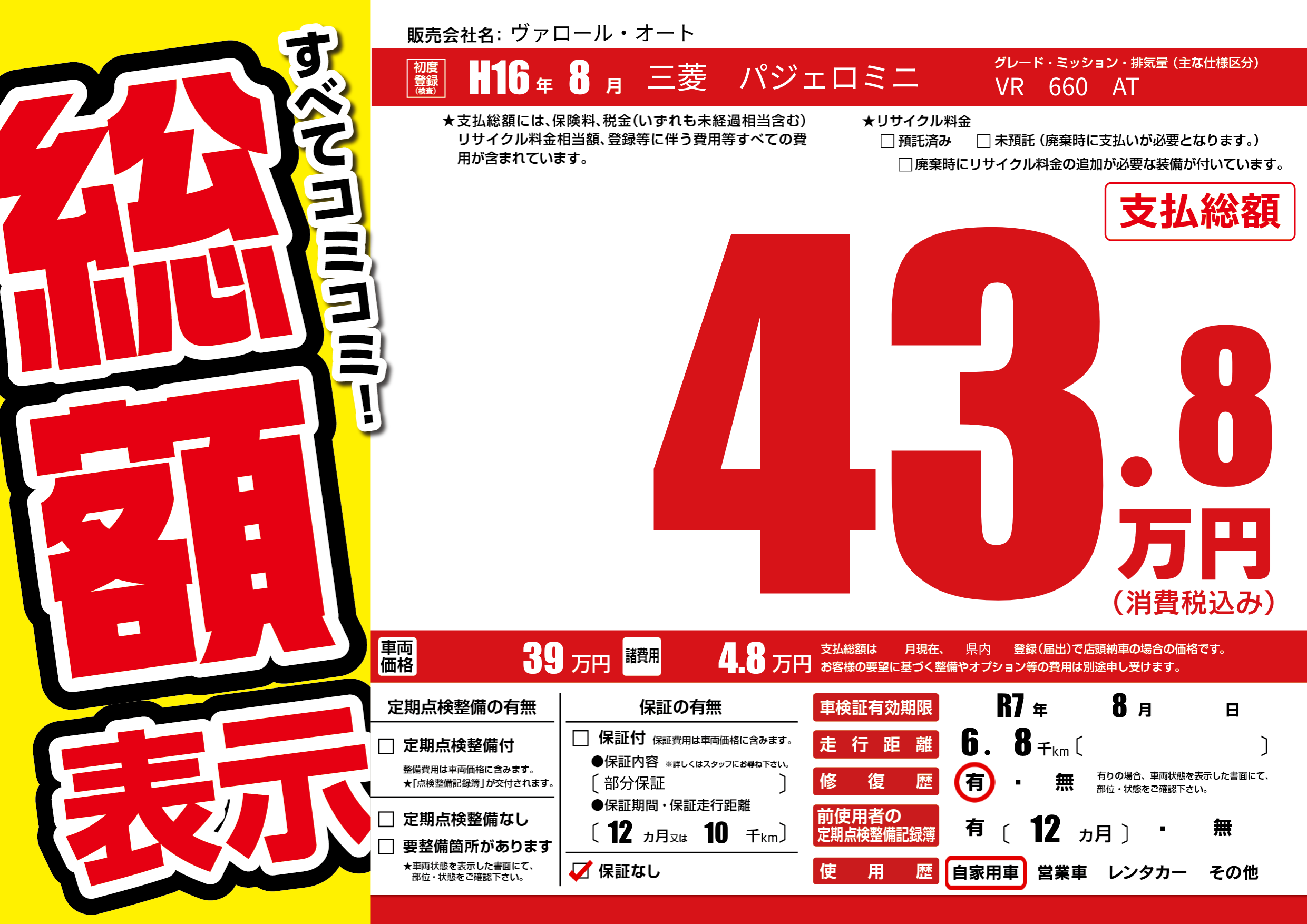| 車検制限 | R7年 8月 - 日 | ||