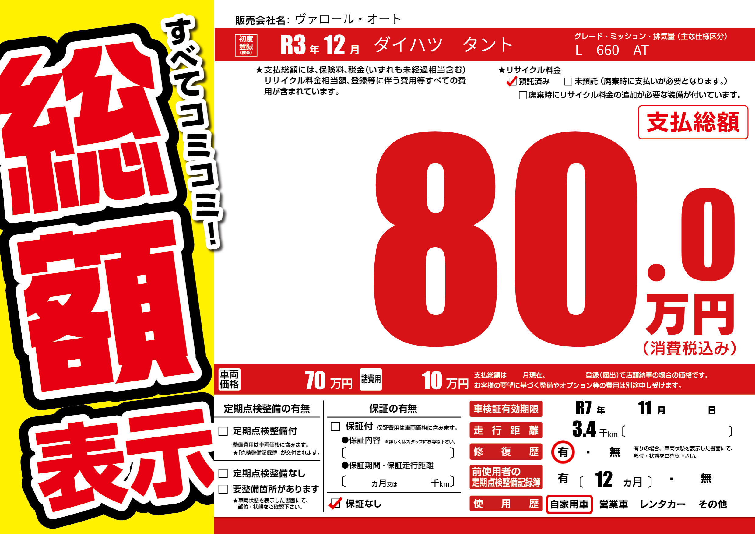 | 車名 | ダイハツ タント | グレード ミッション 排気量 |
