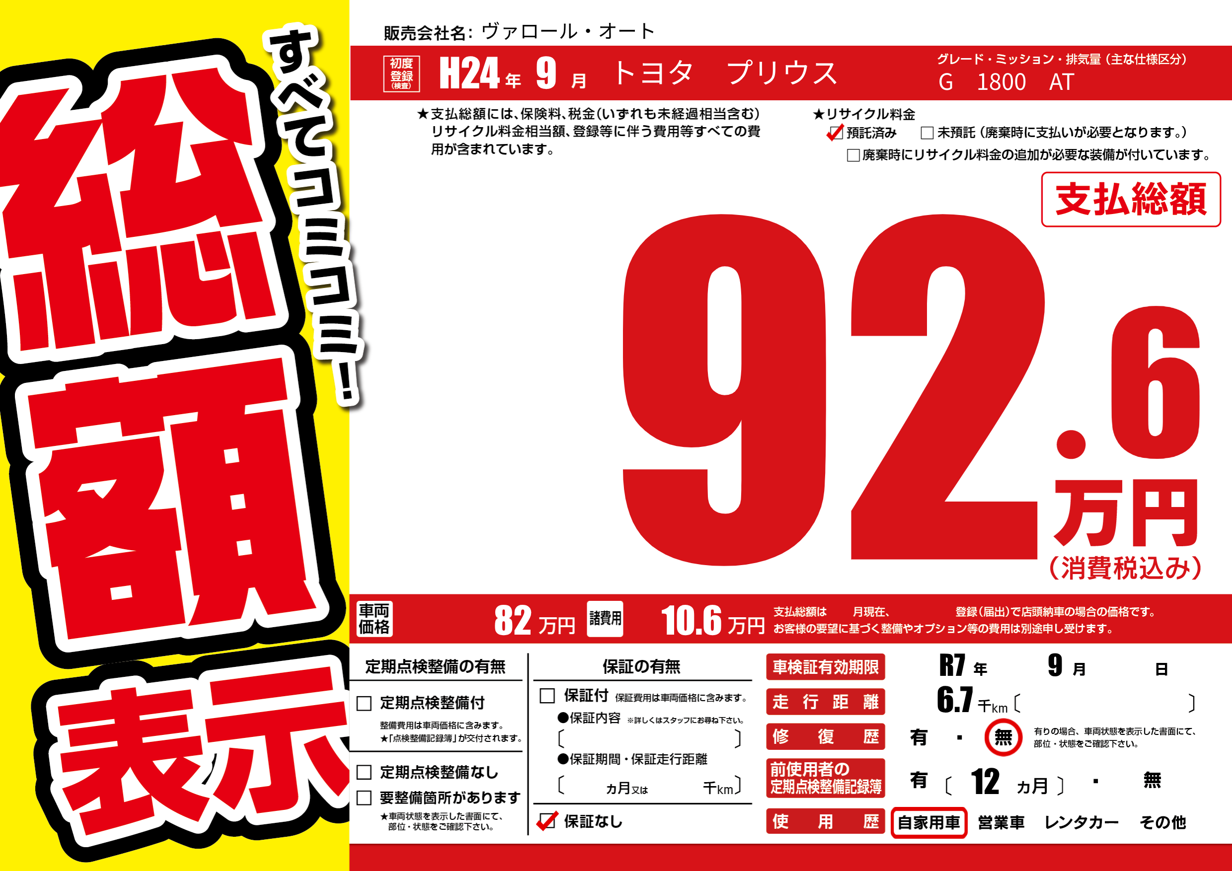 | 車名 | トヨタ プリウス | グレード ミッション 排気量 |