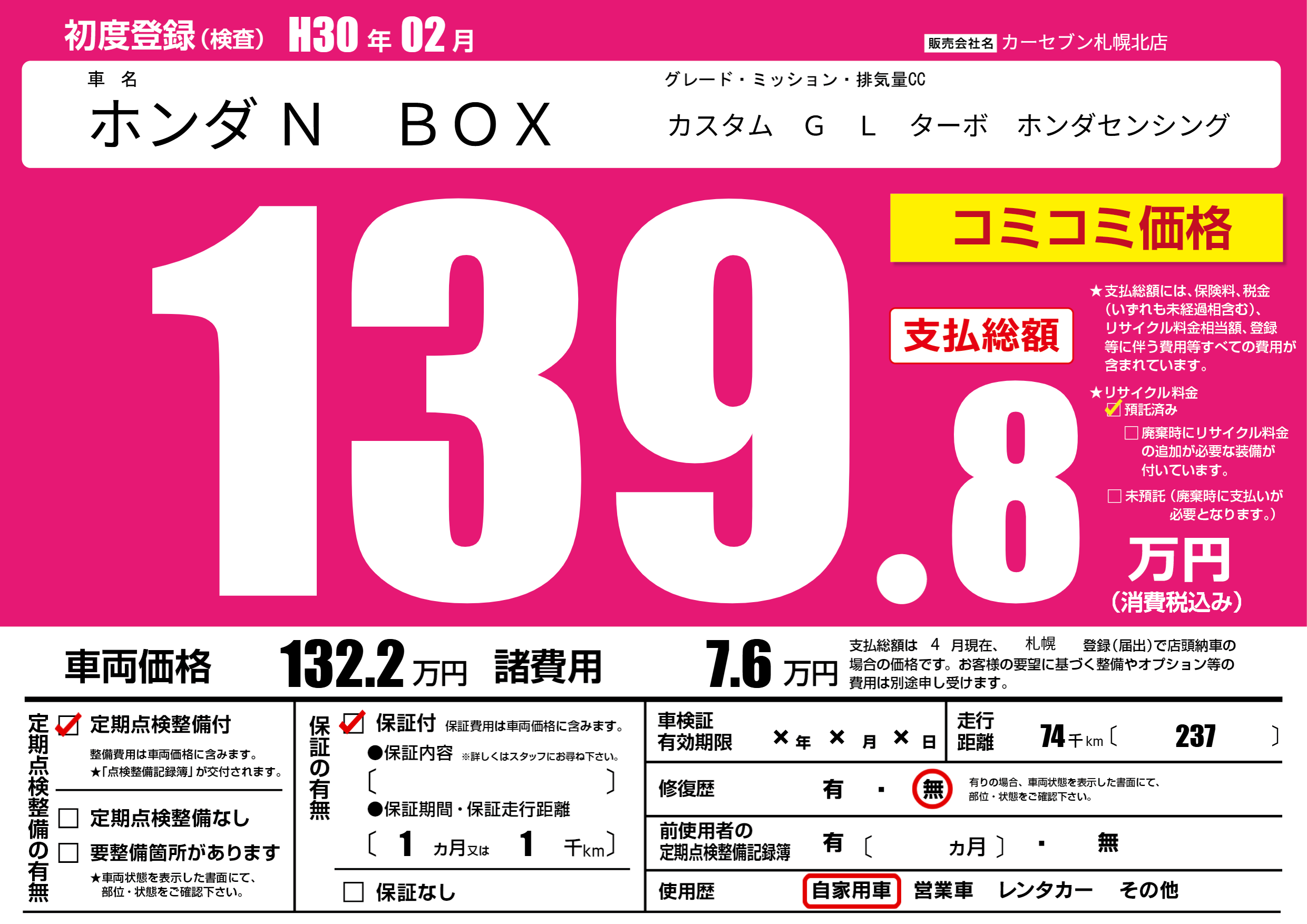 | 走行キロ | 7.4万km | 初年度登録 | H30年02月 |