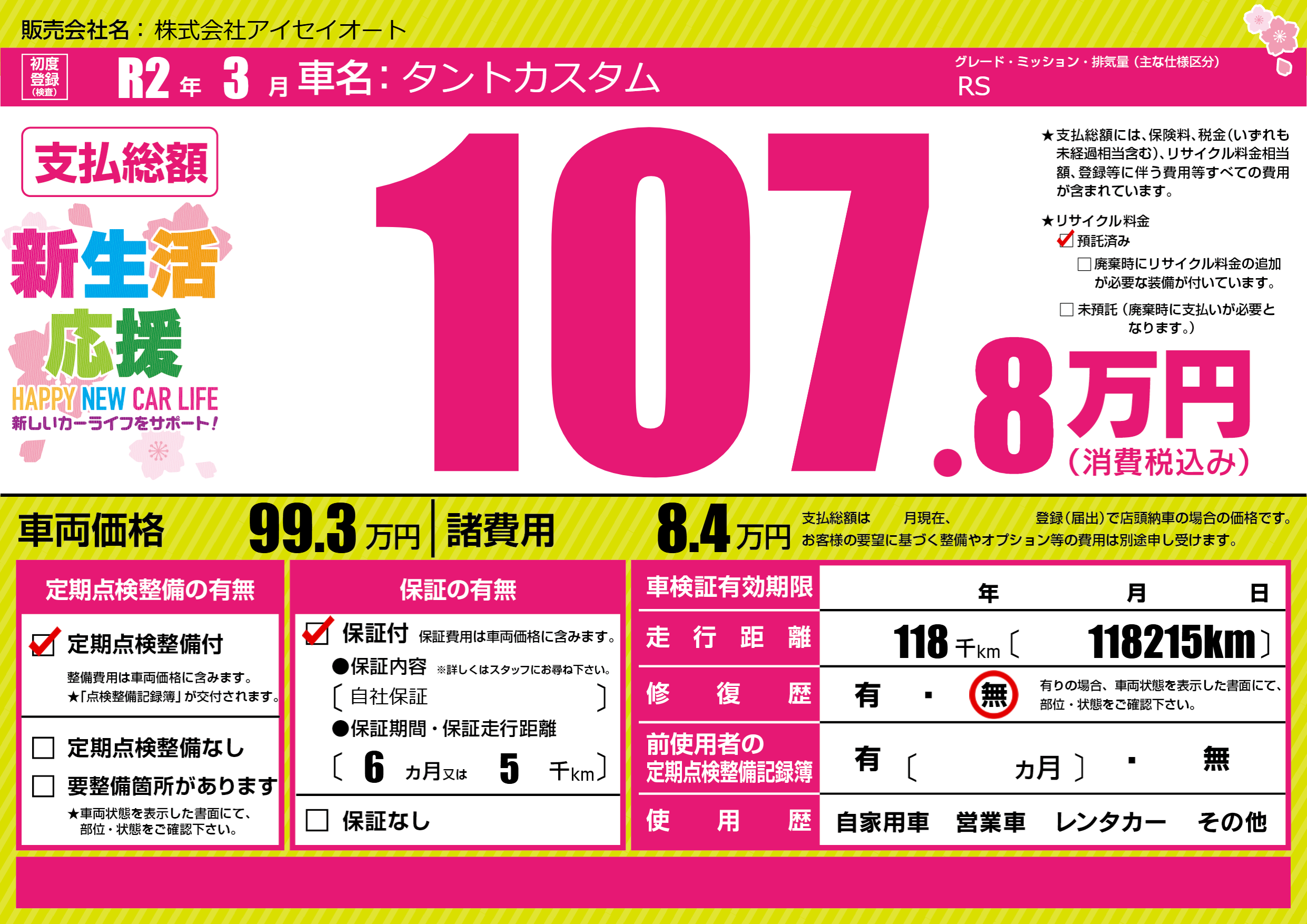 | 走行キロ | 11.8万km | 初年度登録 | R2年3月 |