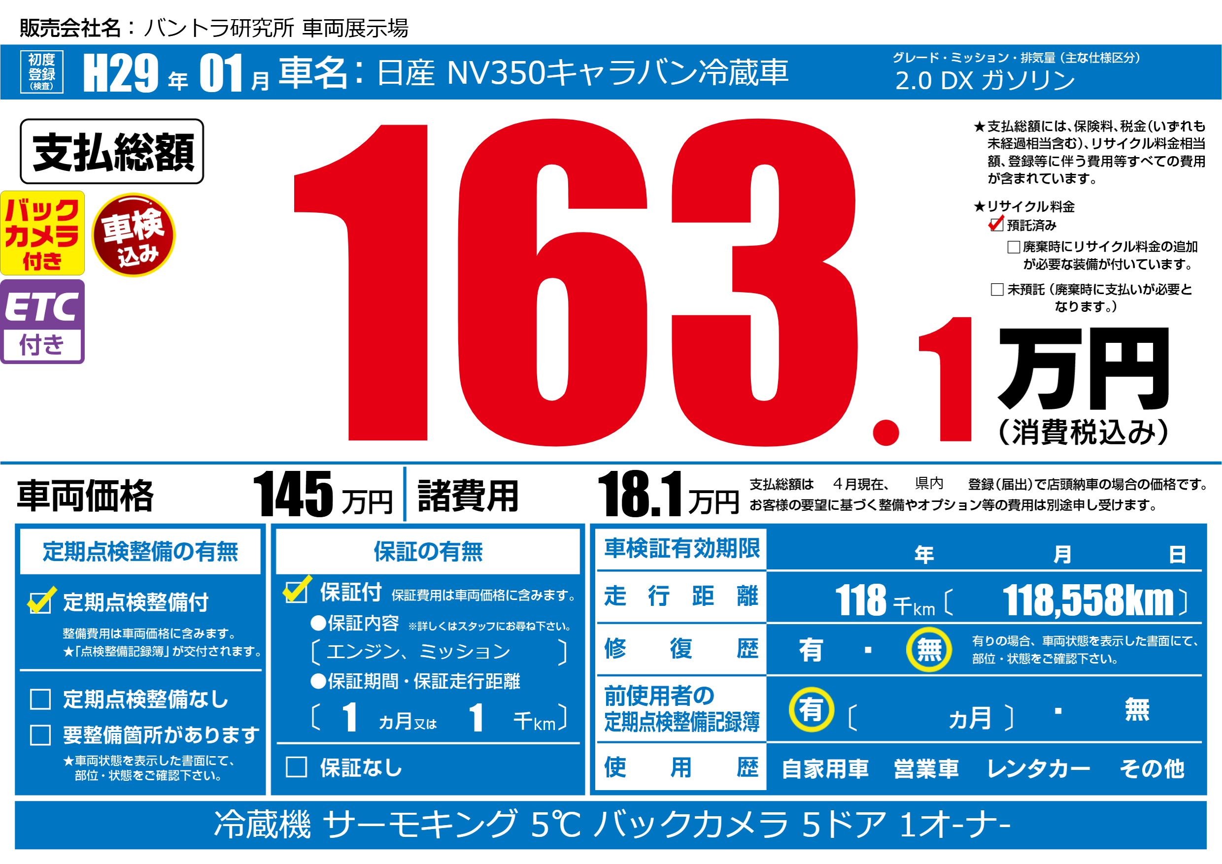 | 車名 | 日産 NV350キャラバン冷蔵車 | グレード ミッション 排気量 |