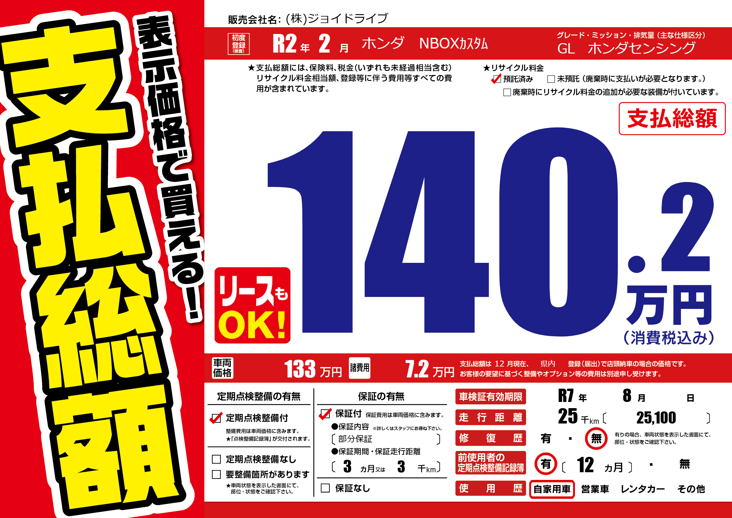 保証付き 保証内容(部分保証) 3ヶ月または(3)千kmまで |