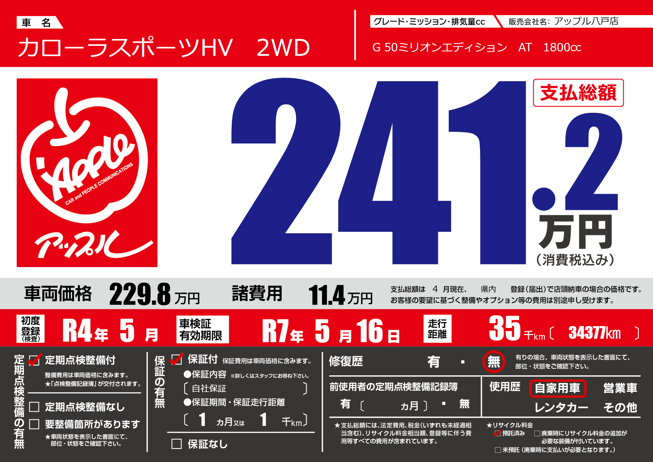 | 車名 | カローラスポーツHV 2WD | グレード ミッション 排気量 |