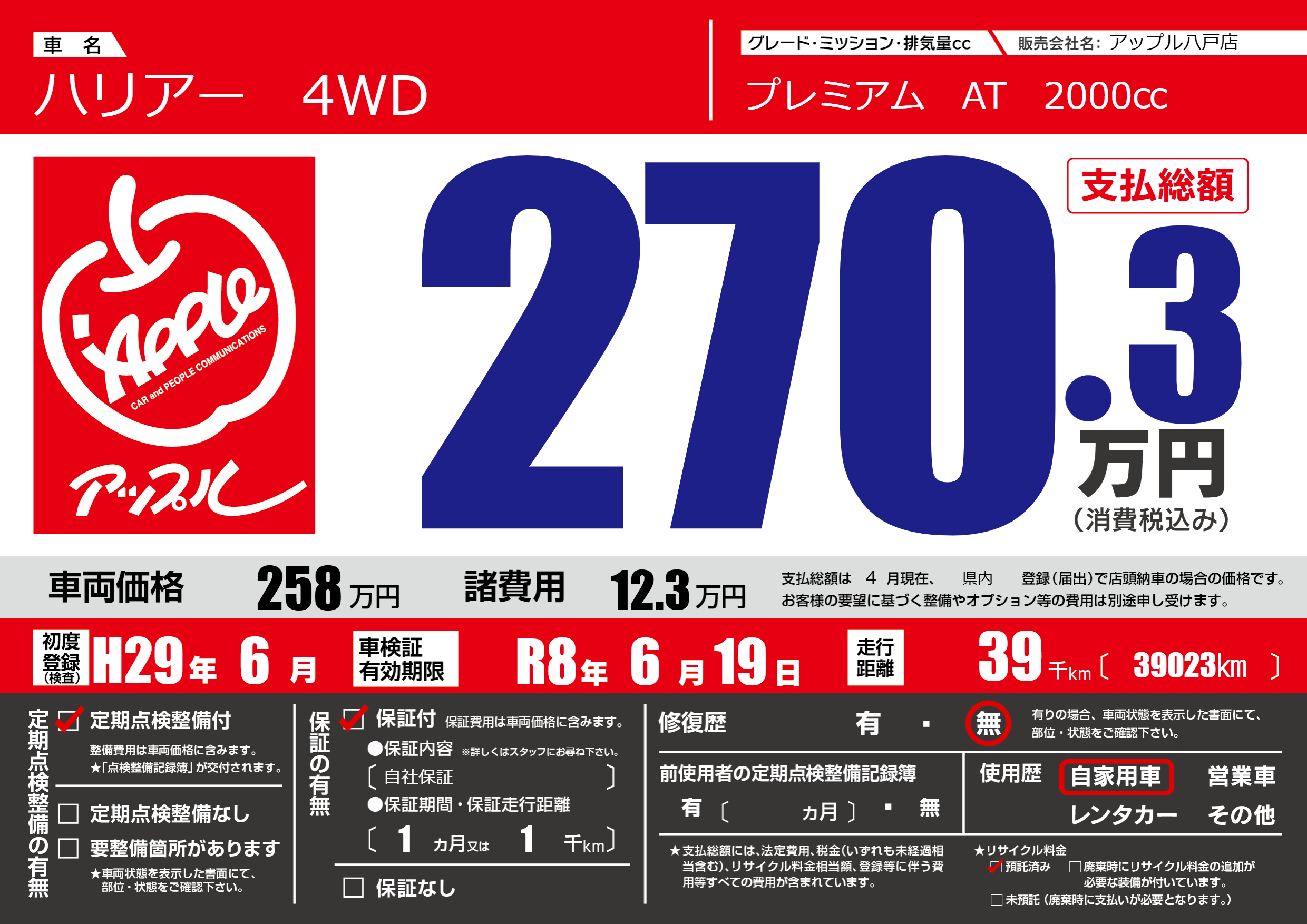 | 車名 | ハリアー 4WD | グレード ミッション 排気量 |