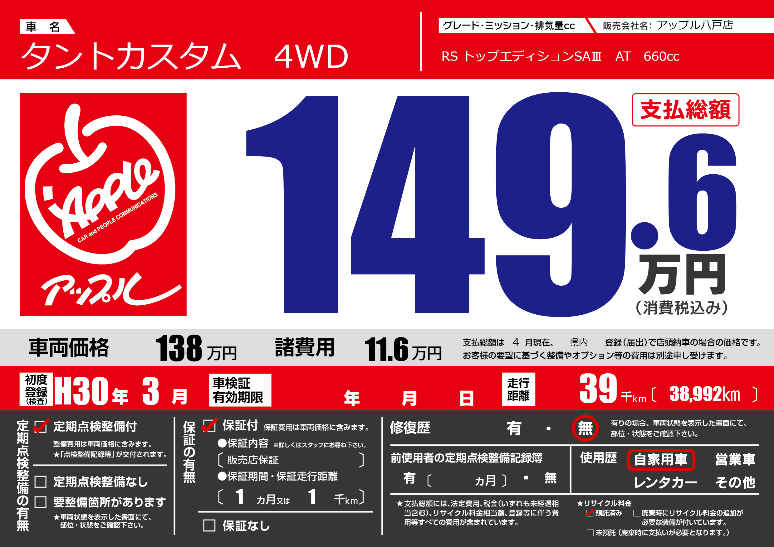 | 走行キロ | 3.9万km | 初年度登録 | H30年3月 |