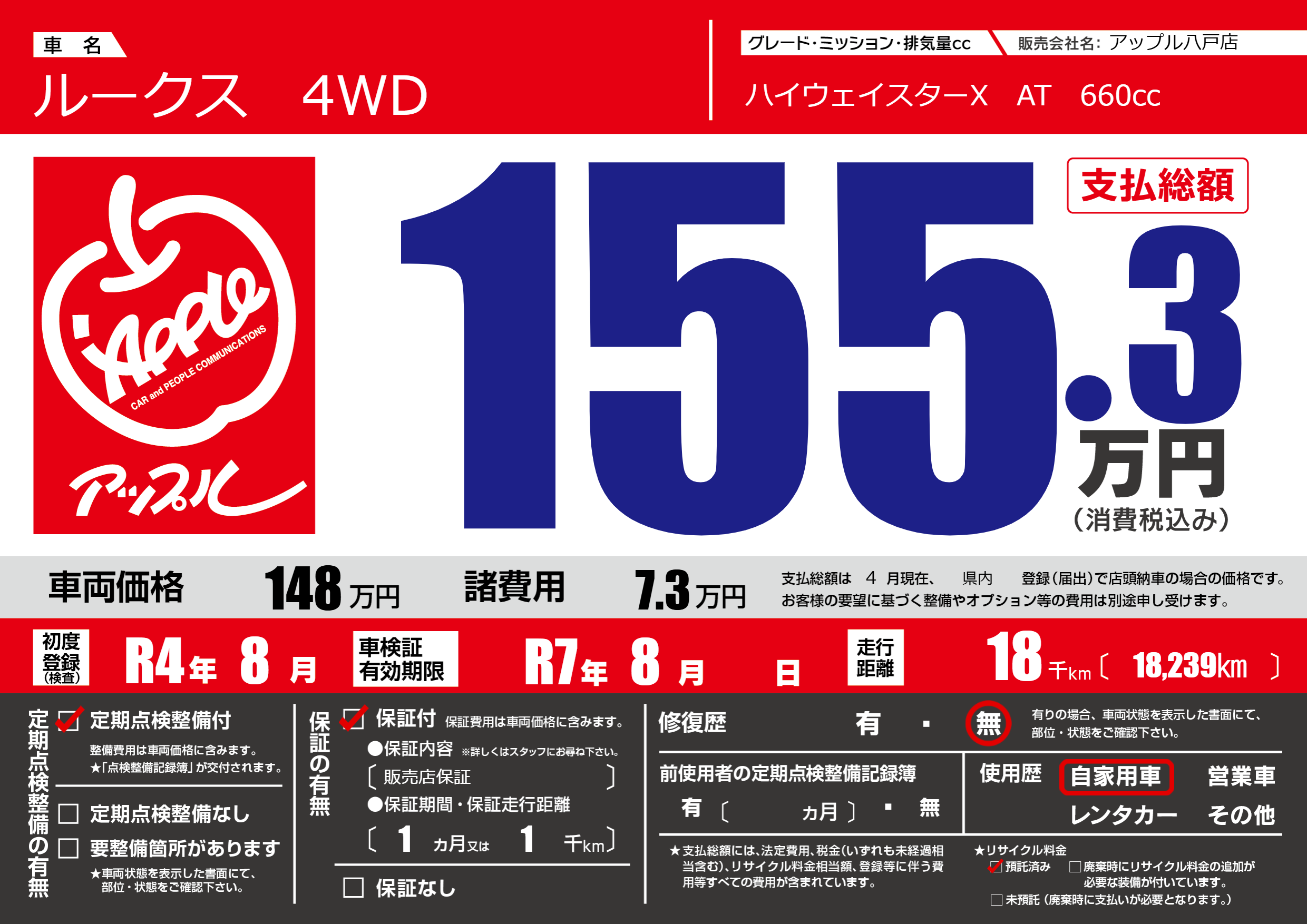 | 走行キロ | 1.8万km | 初年度登録 | R4年8月 |
