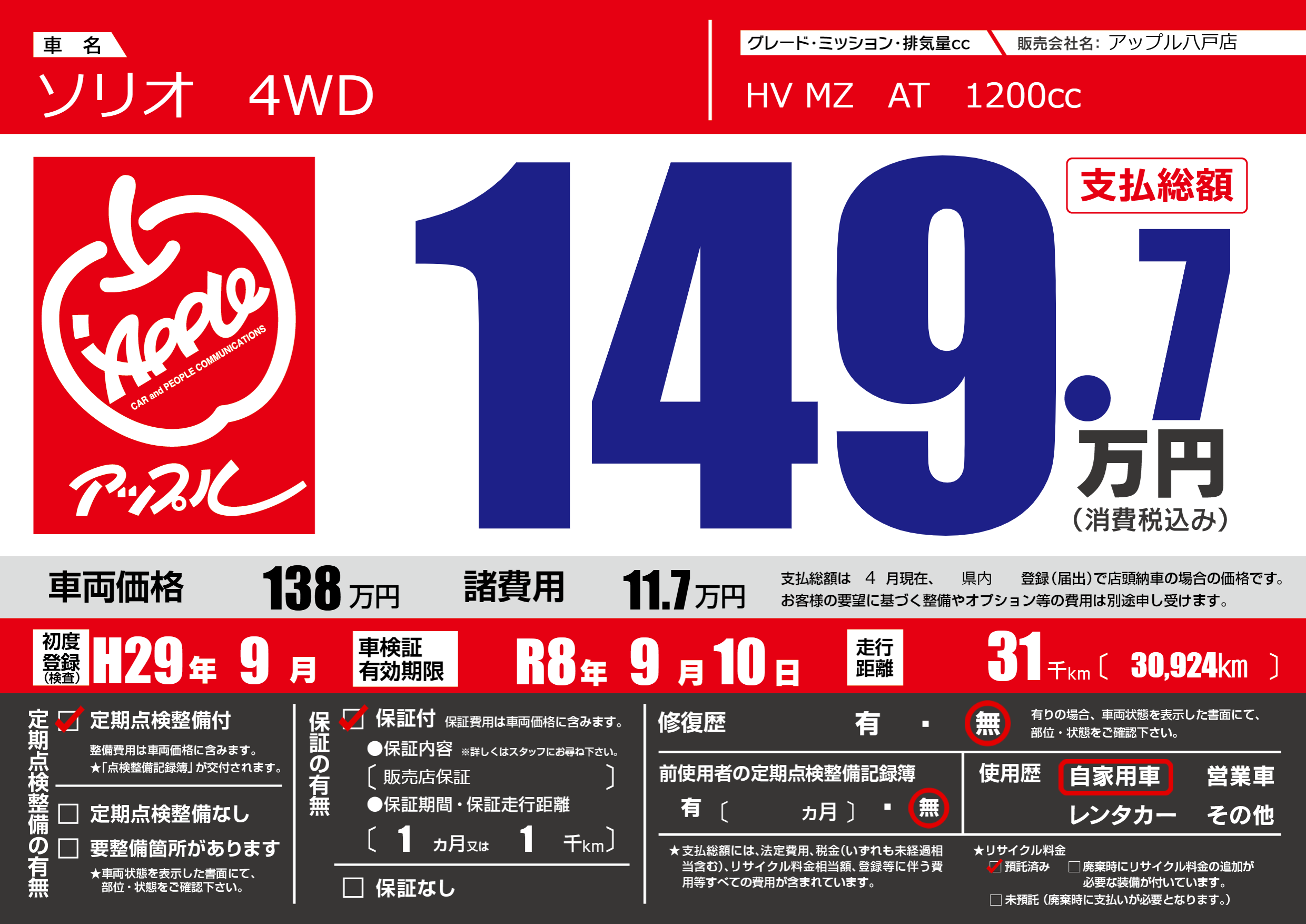 | 車検制限 | R8年 9月 10日 | ||