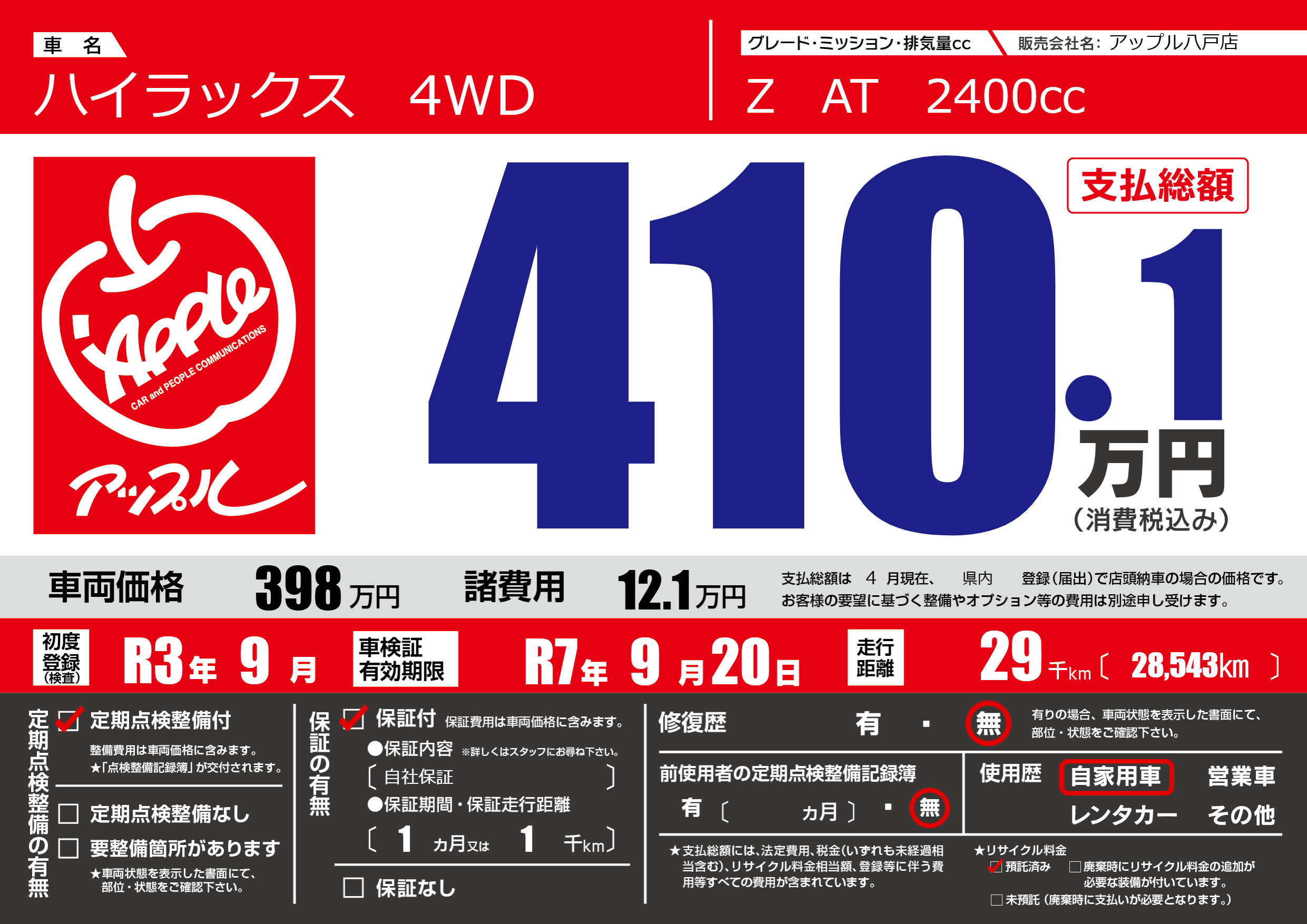 | 車名 | ハイラックス 4WD | グレード ミッション 排気量 |