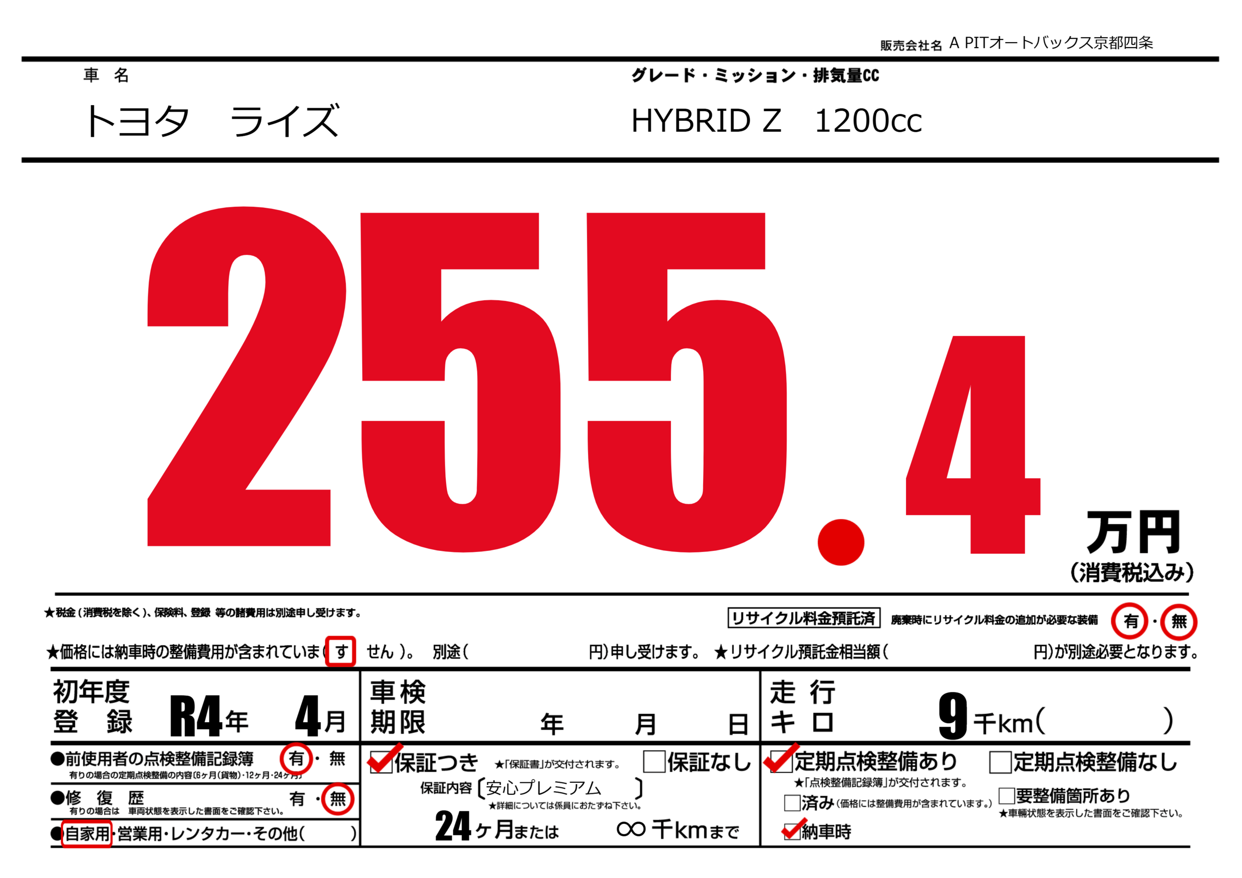 | 車名 | トヨタ ライズ | グレード ミッション 排気量 |