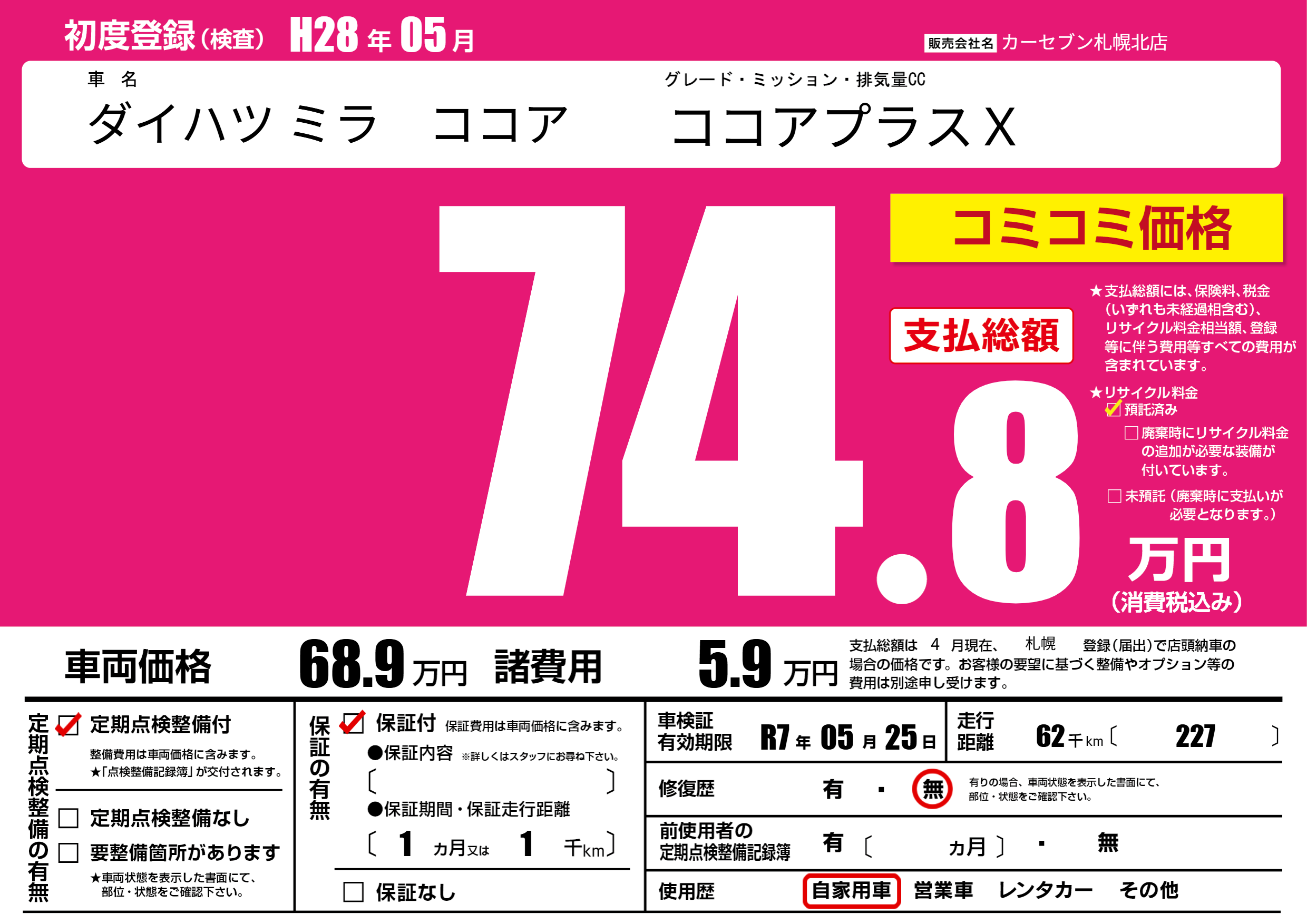 | 走行キロ | 6.2万km | 初年度登録 | H28年05月 |