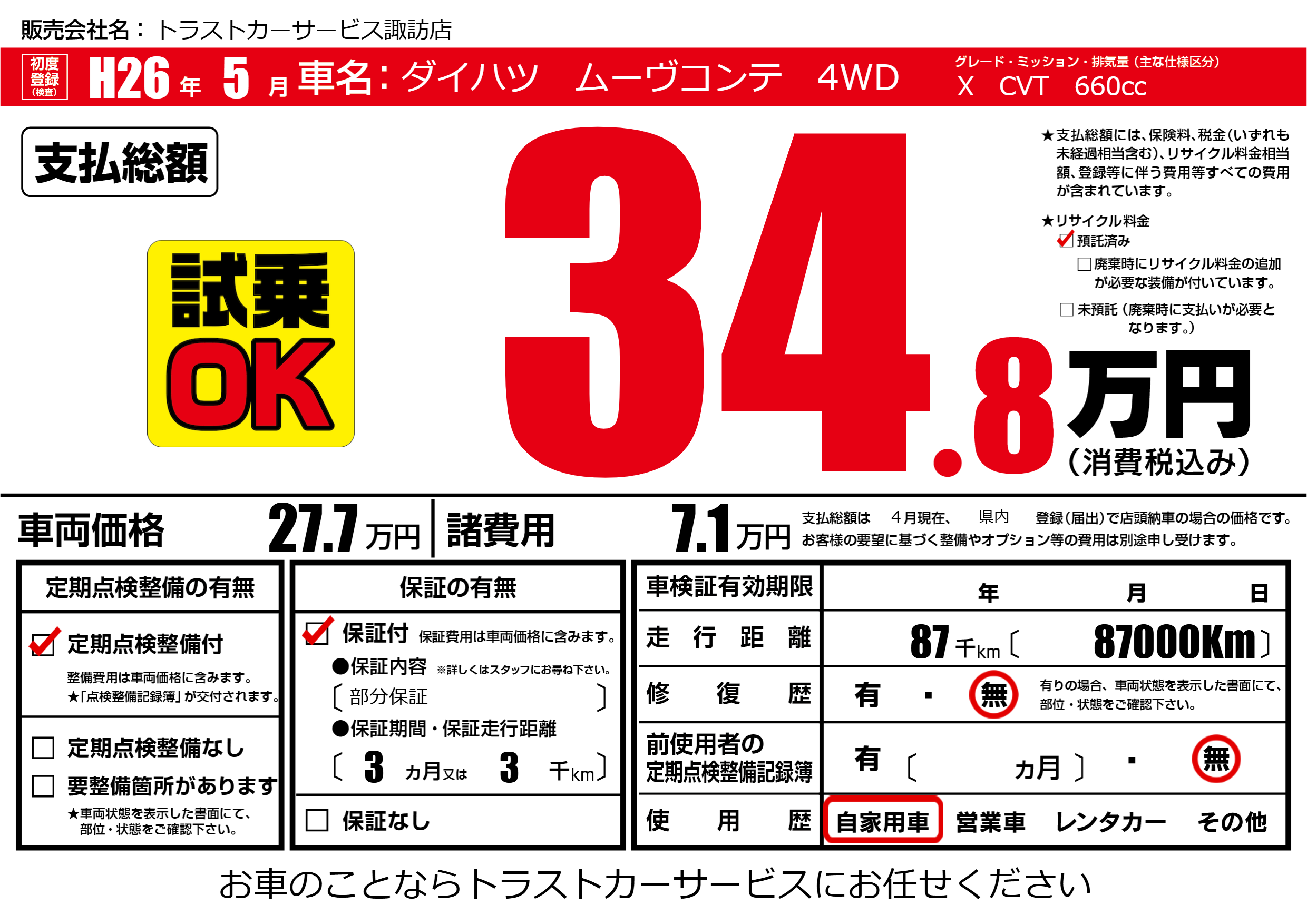 | 車名 | ダイハツ ムーヴコンテ 4WD | グレード ミッション 排気量 |