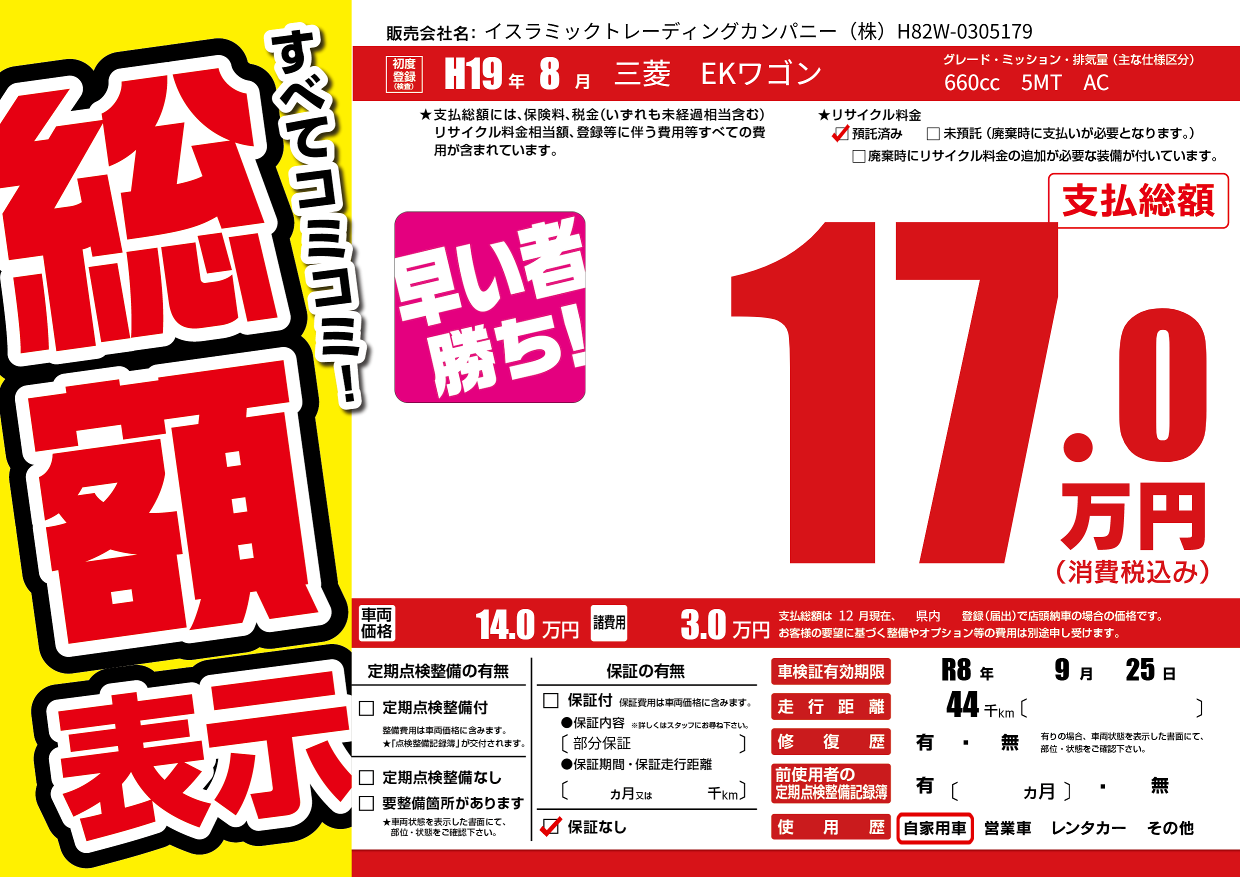 | 車名 | 三菱 EKワゴン | グレード ミッション 排気量 |