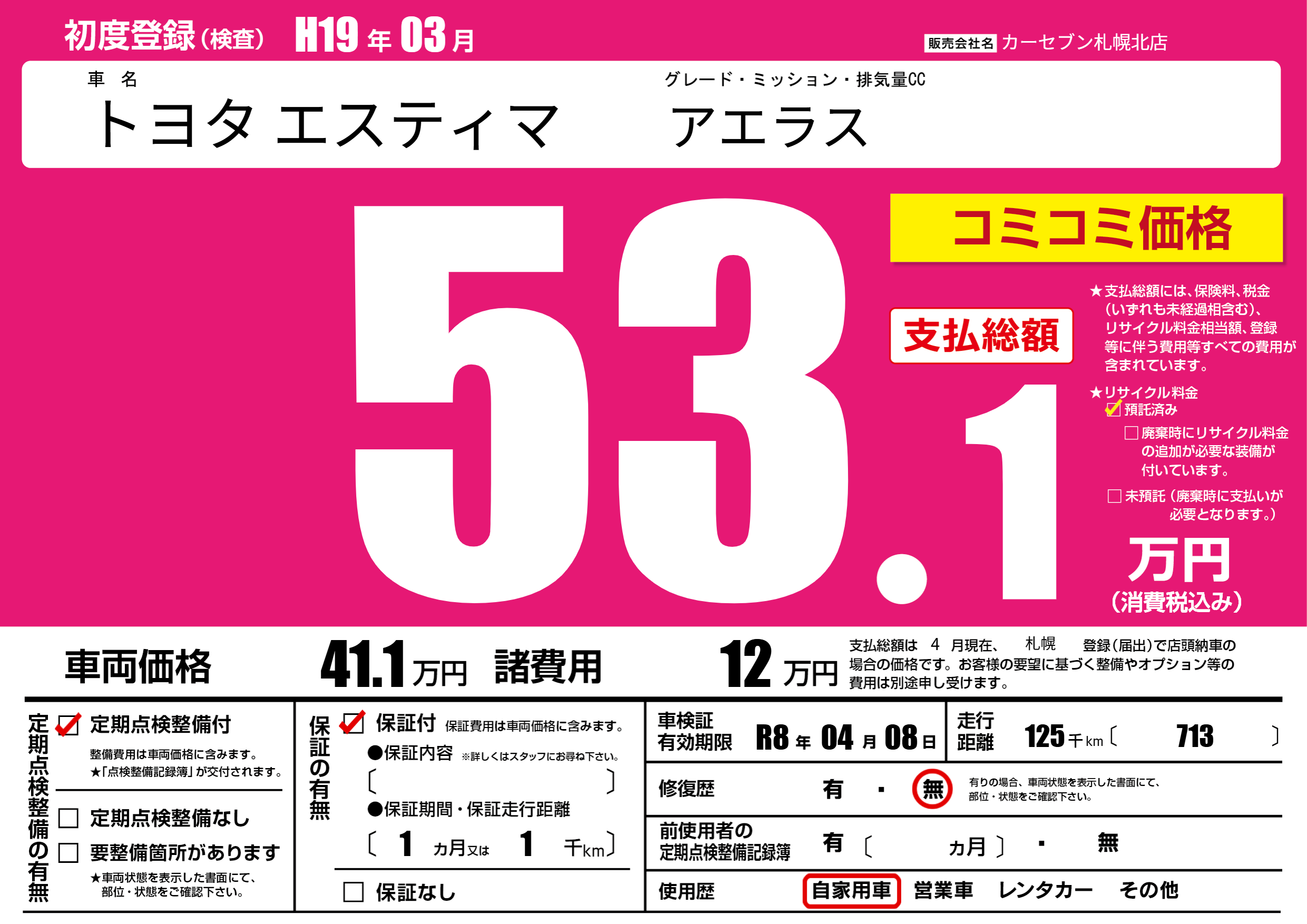 | 走行キロ | 12.5万km | 初年度登録 | H19年03月 |
