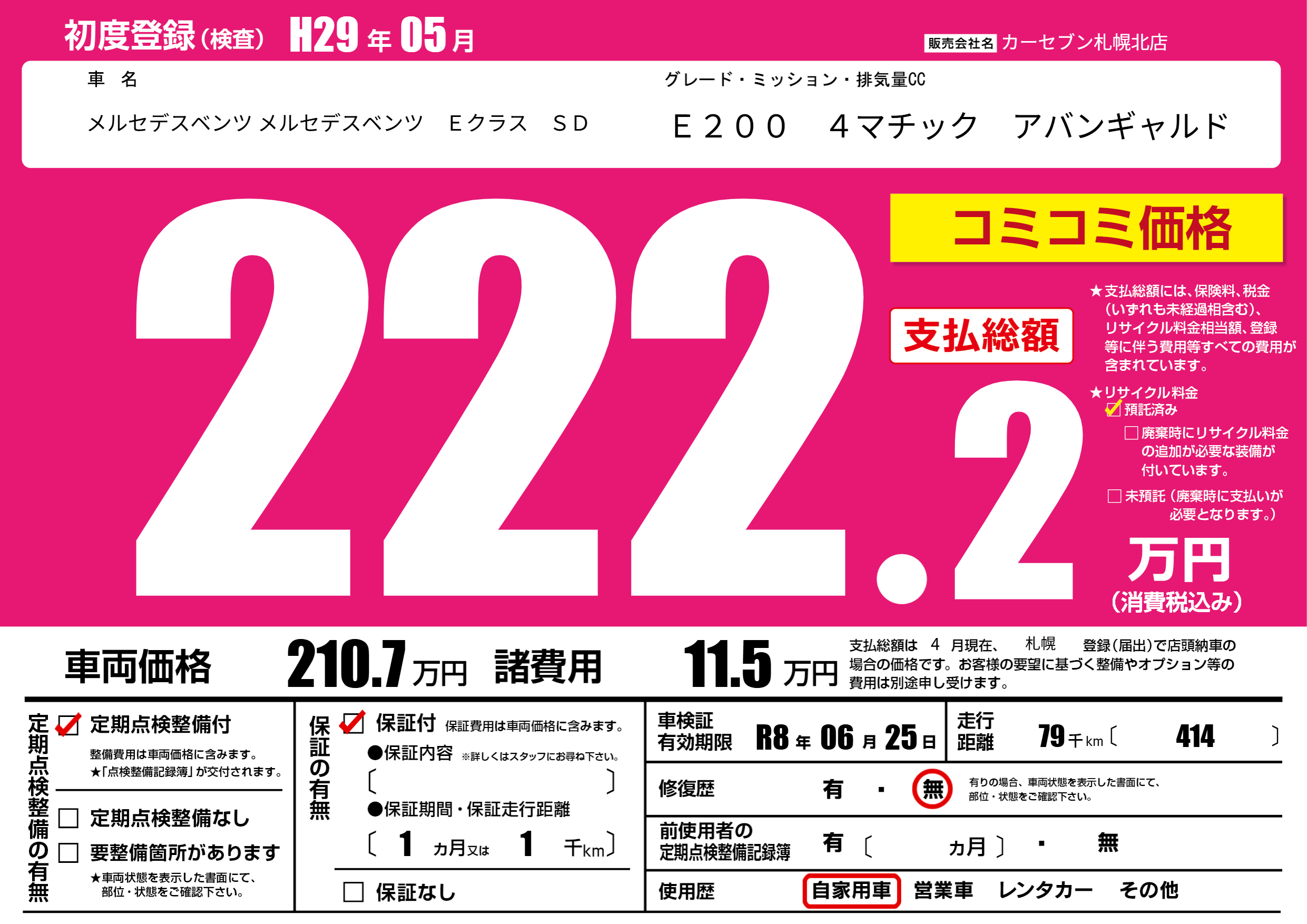 | 車名 | メルセデスベンツ メルセデスベンツ Eクラス SD | グレード ミッション 排気量 |