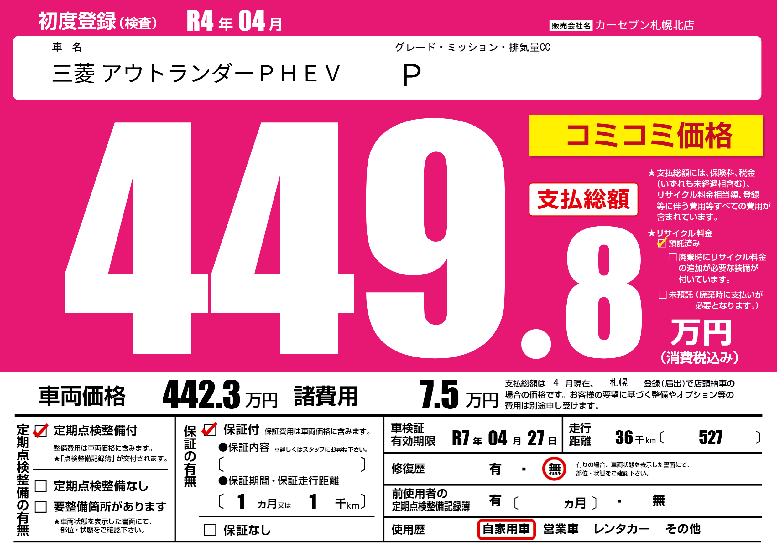 | 車検制限 | R7年 04月 27日 | ||