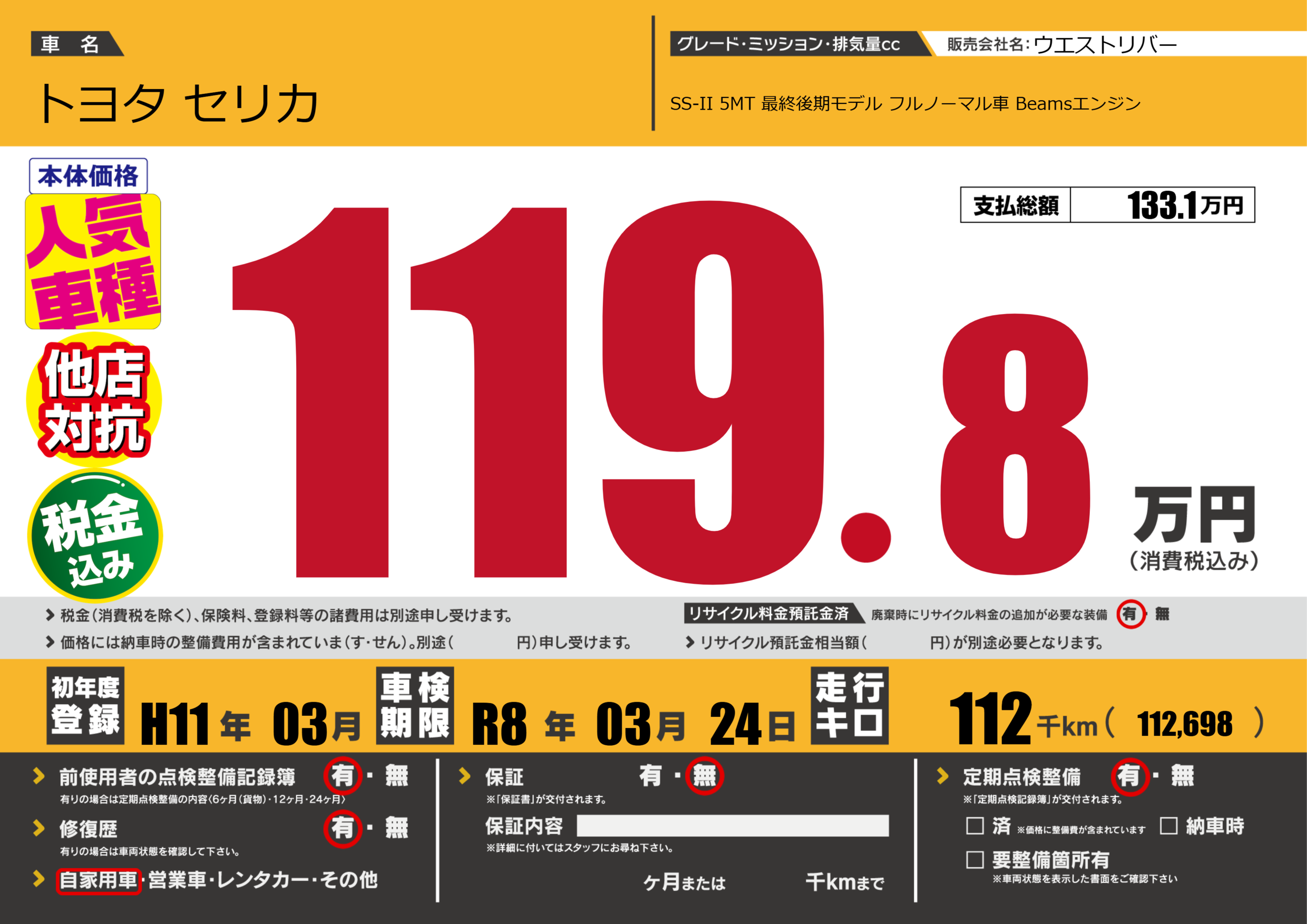 | 走行キロ | 11.2万km | 初年度登録 | H11年03月 |