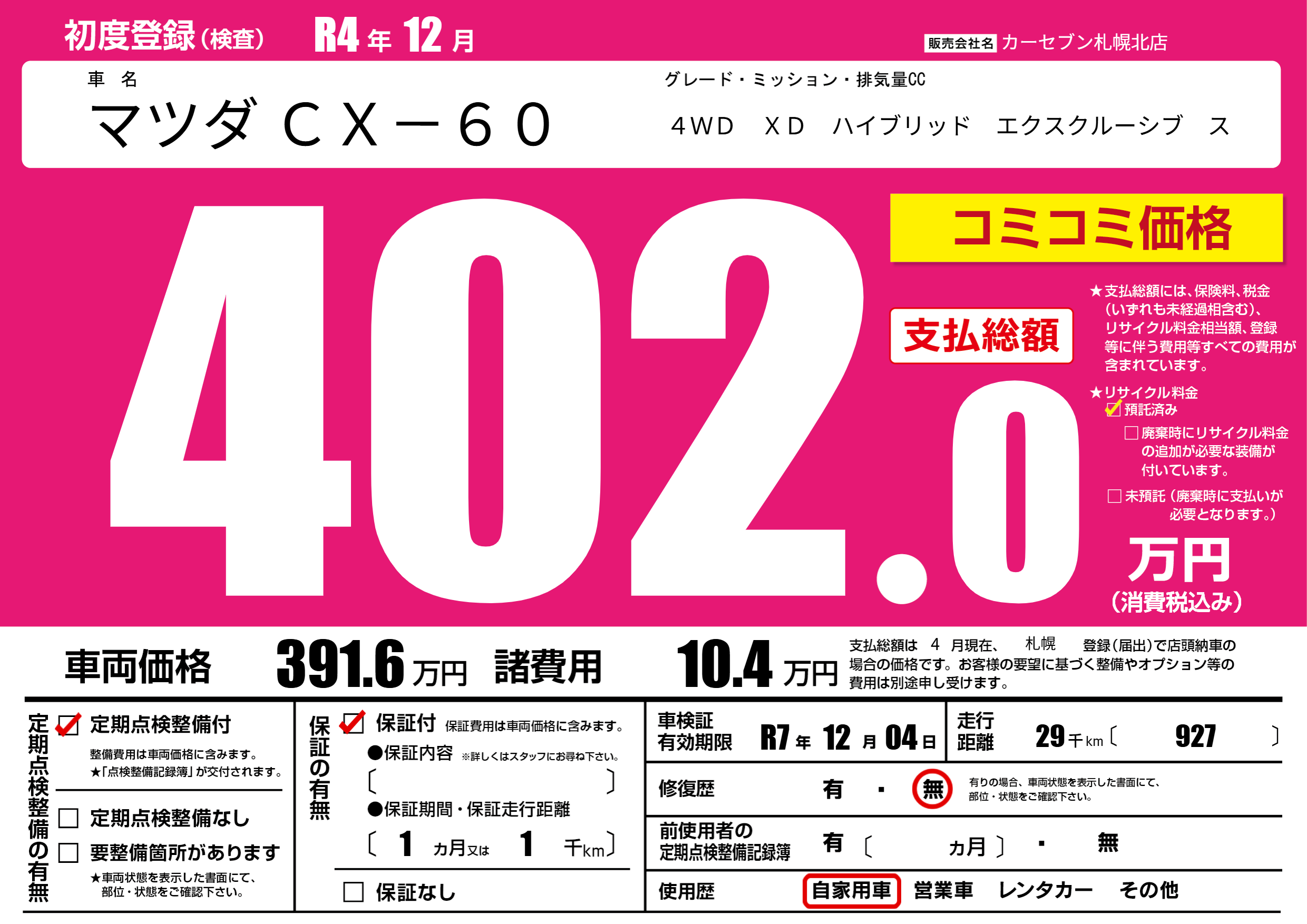 | 車名 | マツダ CX-60 | グレード ミッション 排気量 |
