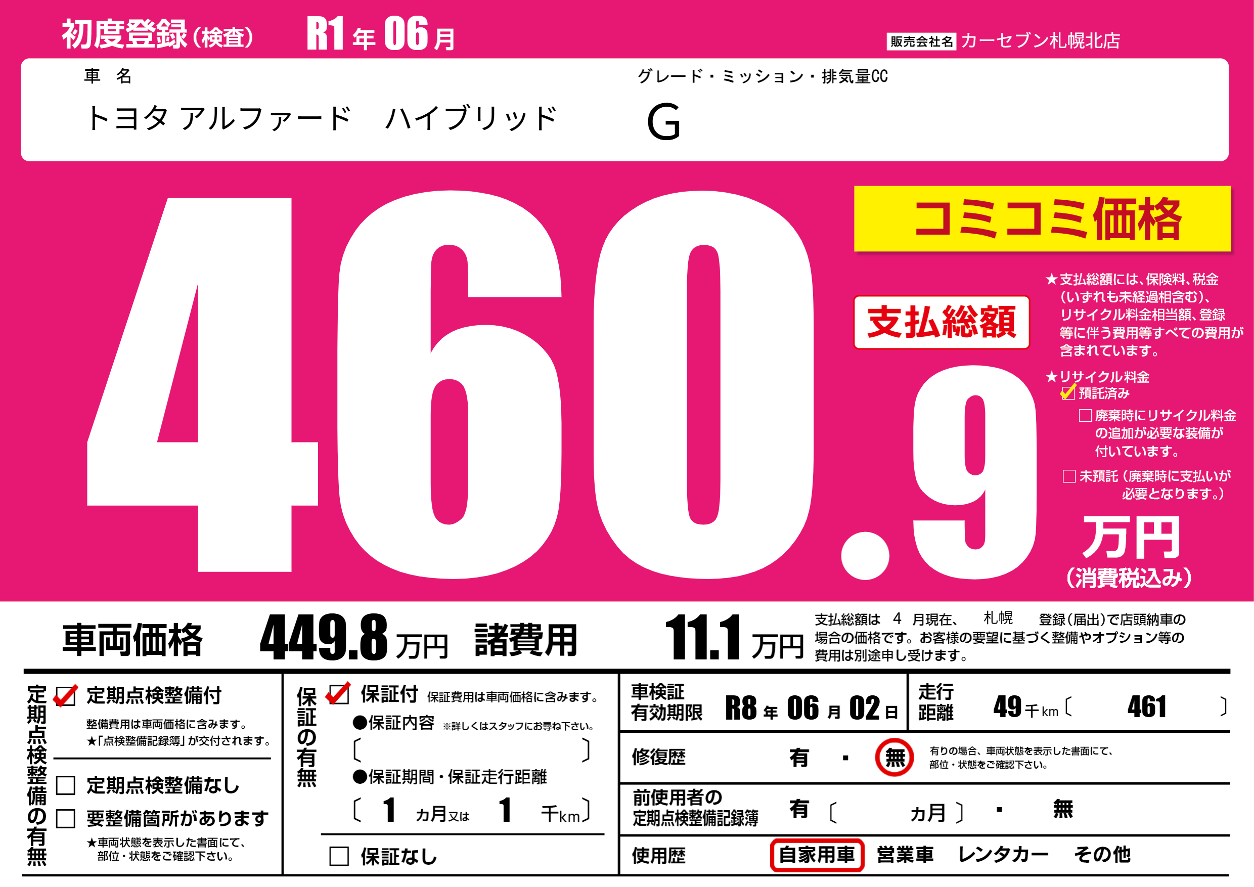 | 車名 | トヨタ アルファード ハイブリッド | グレード ミッション 排気量 |