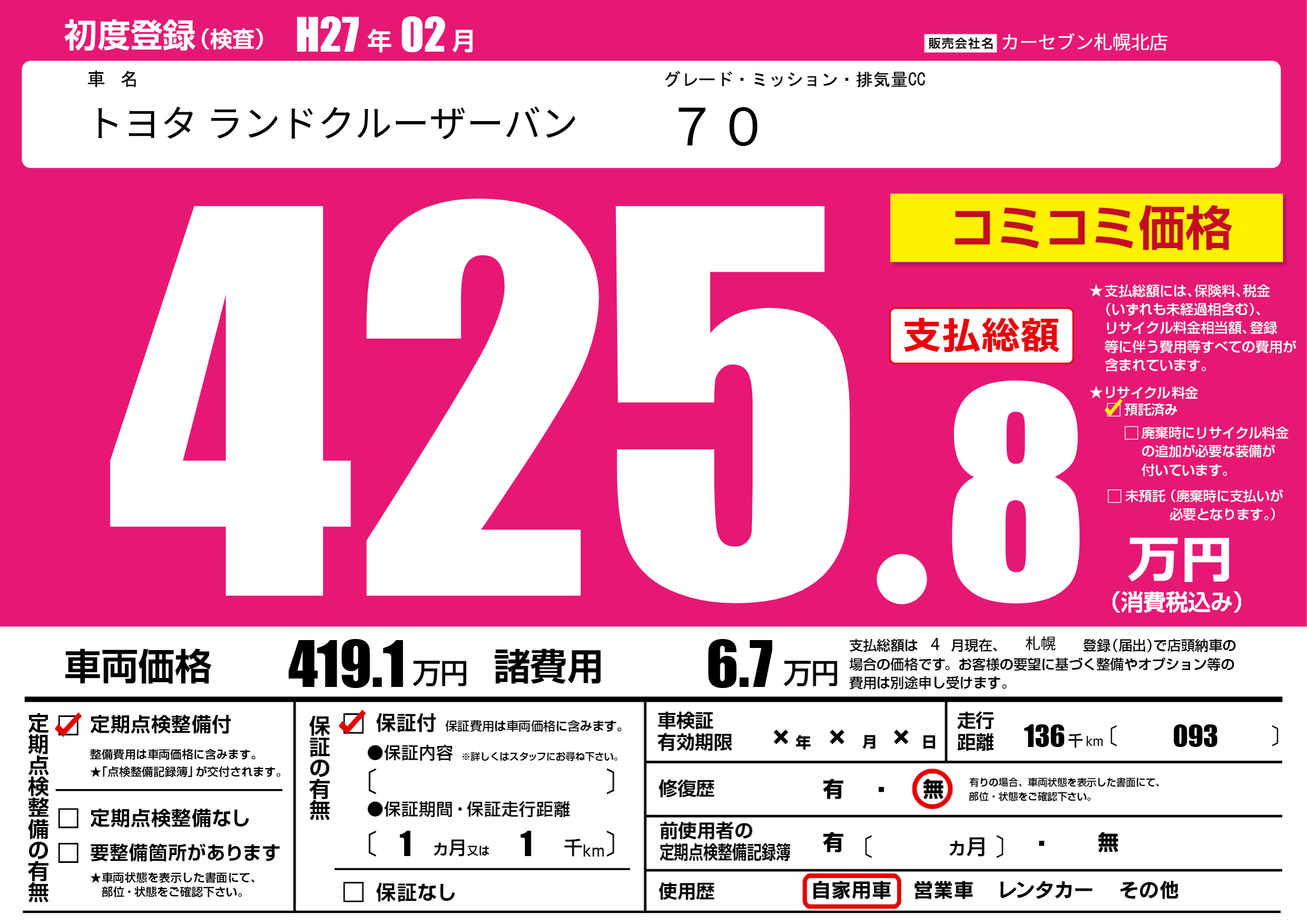 | 走行キロ | 13.6万km | 初年度登録 | H27年02月 |