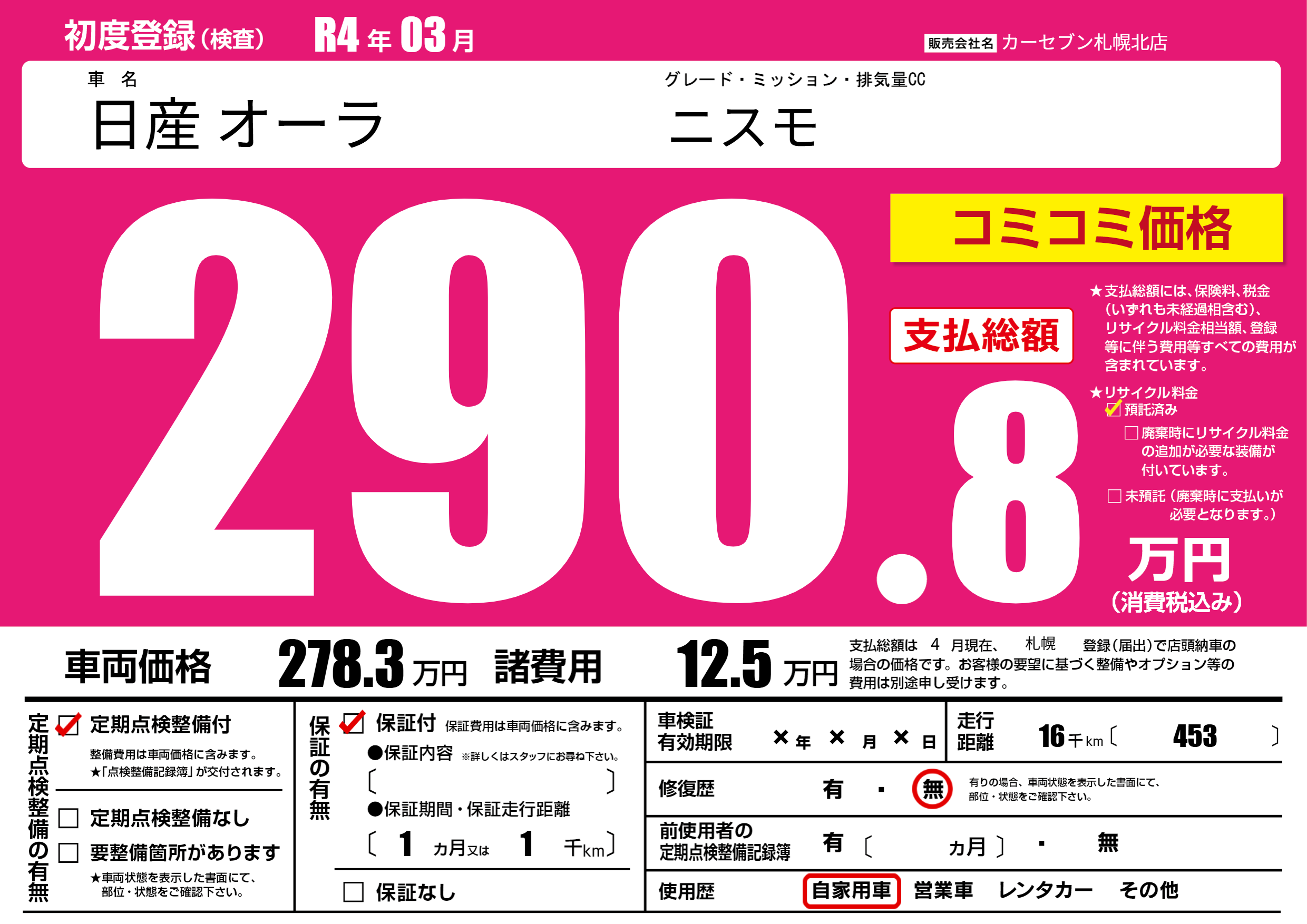 | 車名 | 日産 オーラ | グレード ミッション 排気量 |