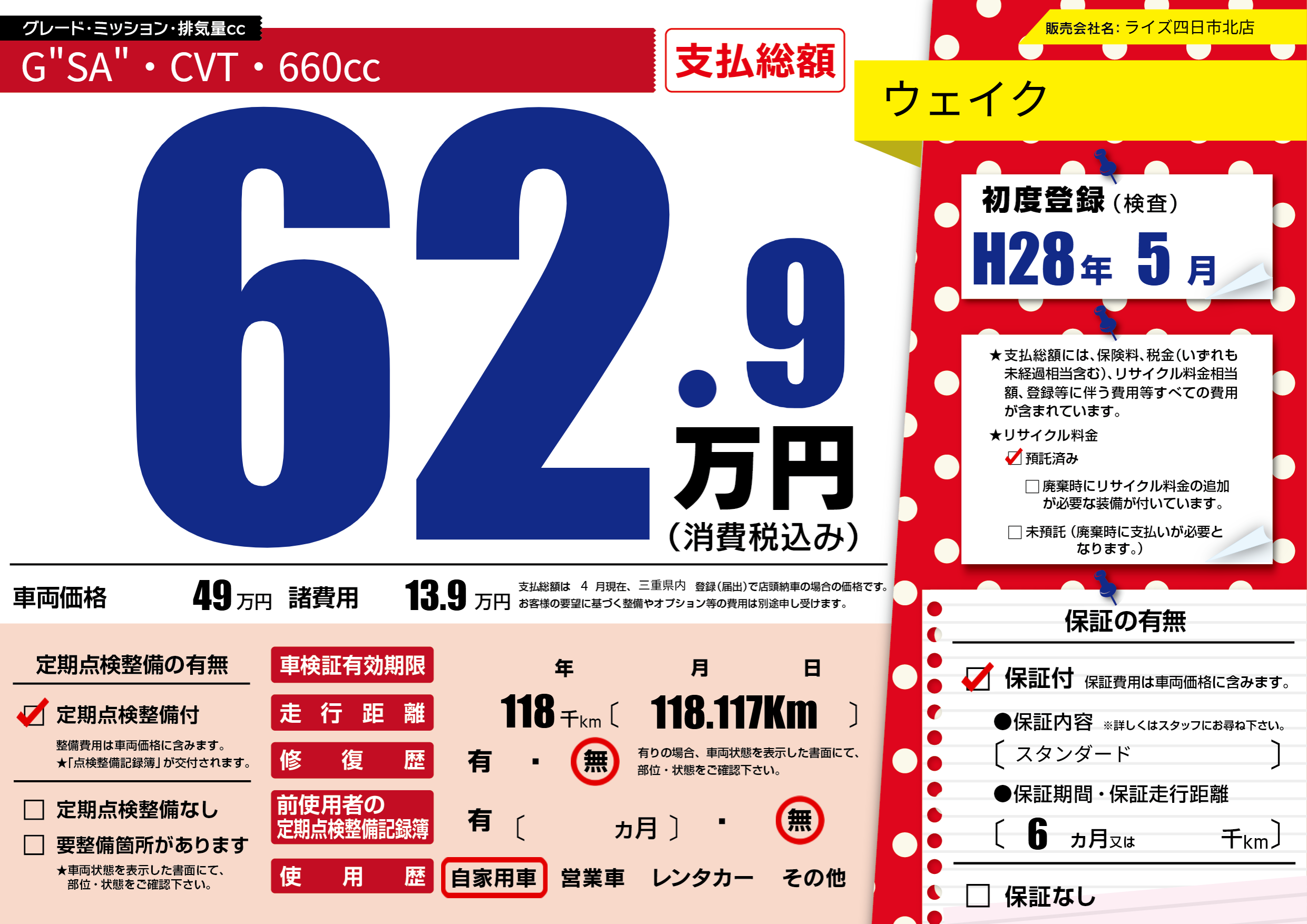 | 車名 | ウェイク | グレード ミッション 排気量 |