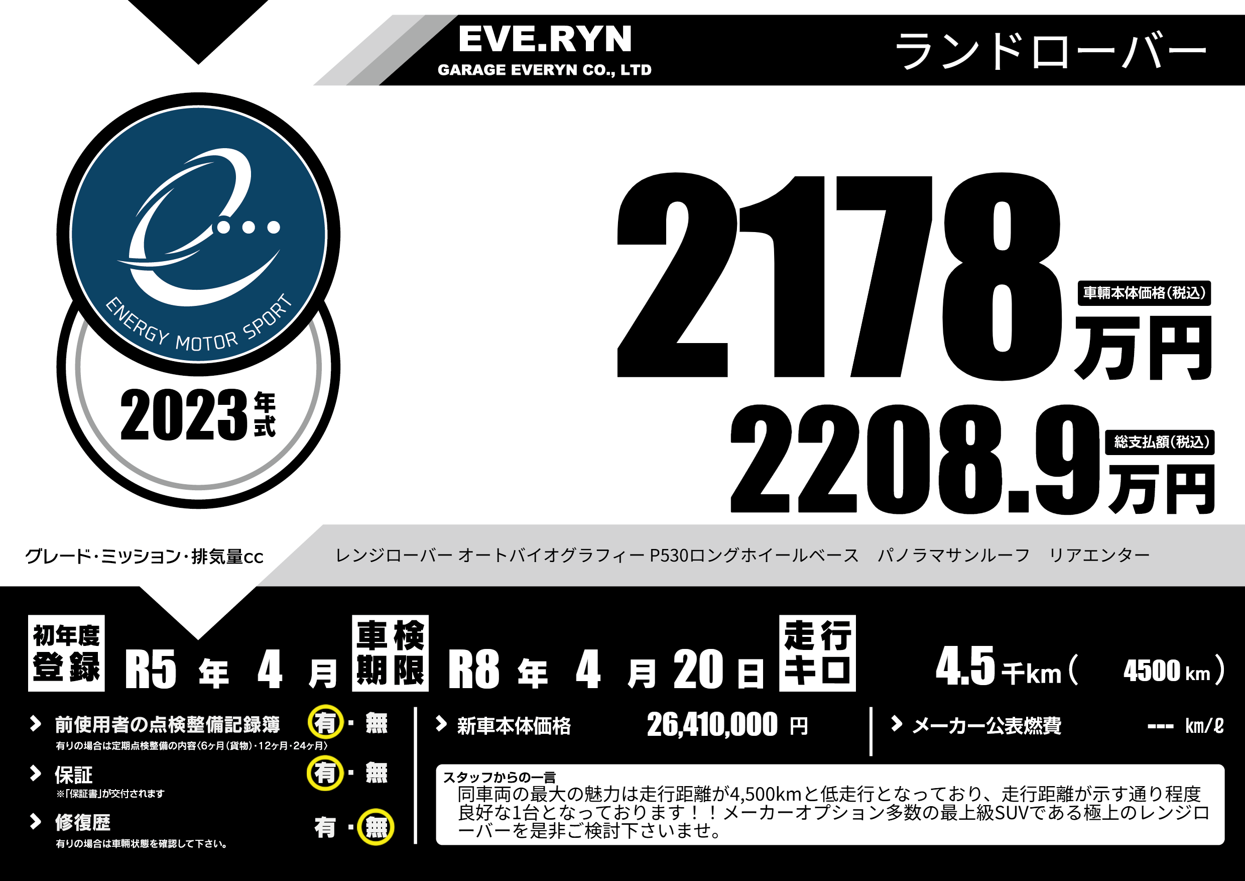| 走行キロ | 0.4万km | 初年度登録 | R5年4月 |