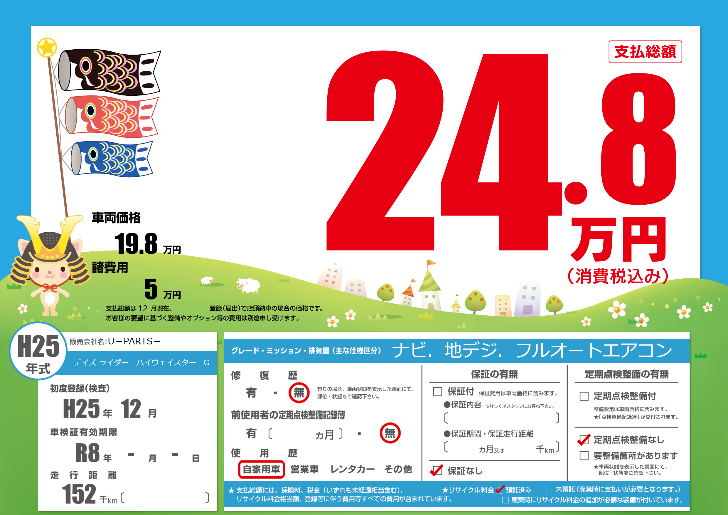 | 走行キロ | 15.2万km | 初年度登録 | H25年12月 |