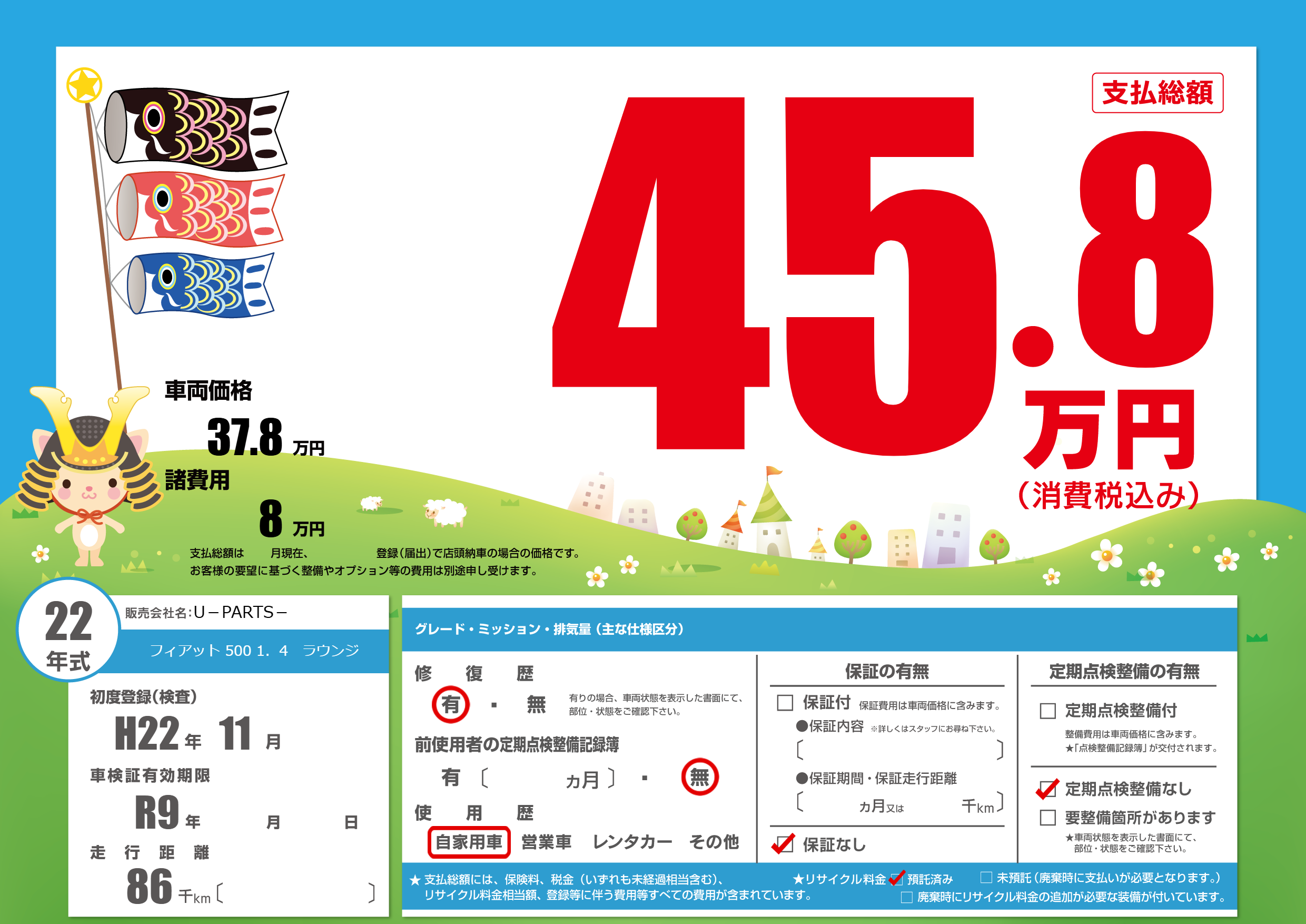 | 車名 | フィアット 500 1.4 ラウンジ | グレード ミッション 排気量 |