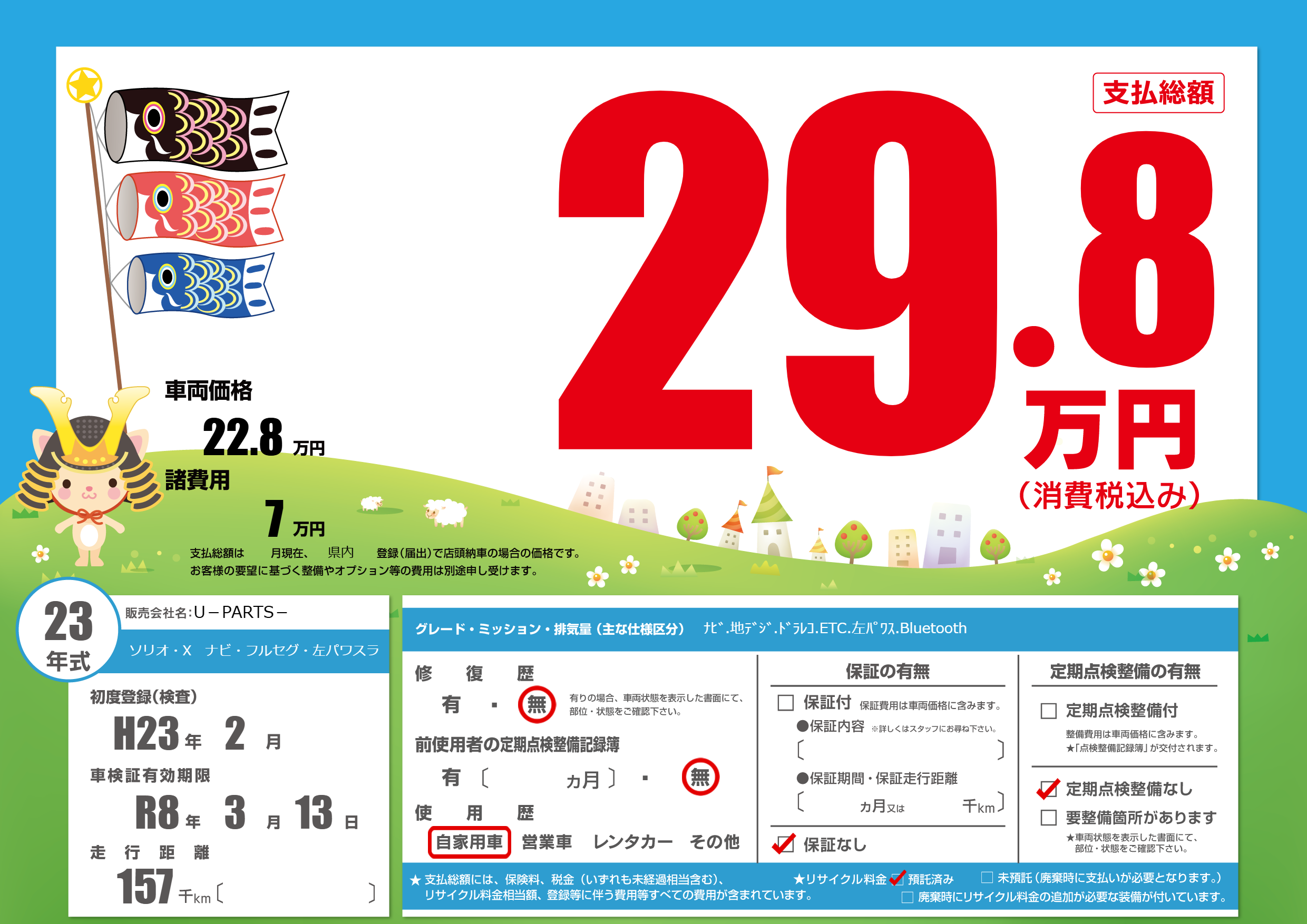 | 車名 | ソリオ・X ナビ・フルセグ・左パワスラ | グレード ミッション 排気量 |